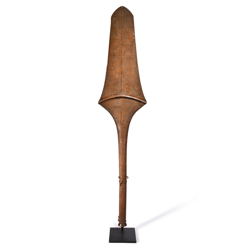 the blade with a curved horizontal ridge and a plain vertical ridge, with all-over carved decoration of zig-zags, lines, lozenges, triangles and arches, the handle with a flared butt, 19th century,