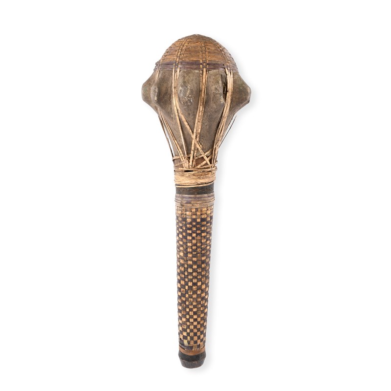 basalt, wood and leaf fibre, with a twelve point head bound to the tapering handle with a carved zig-zag band and a chequer woven binding,