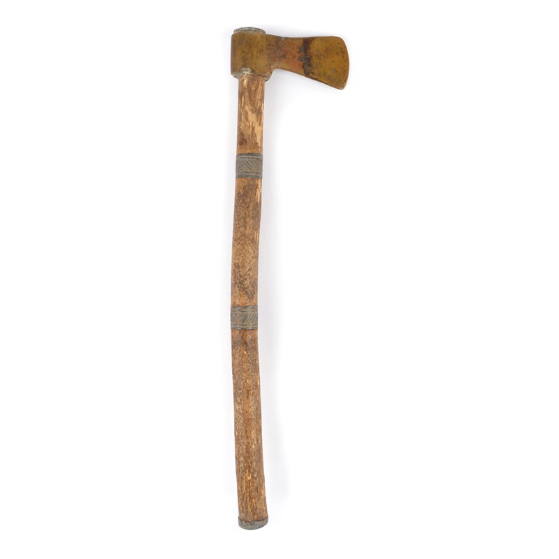 A North American tomahawk with a brass head and a wood shaft with two lead bands and a cap