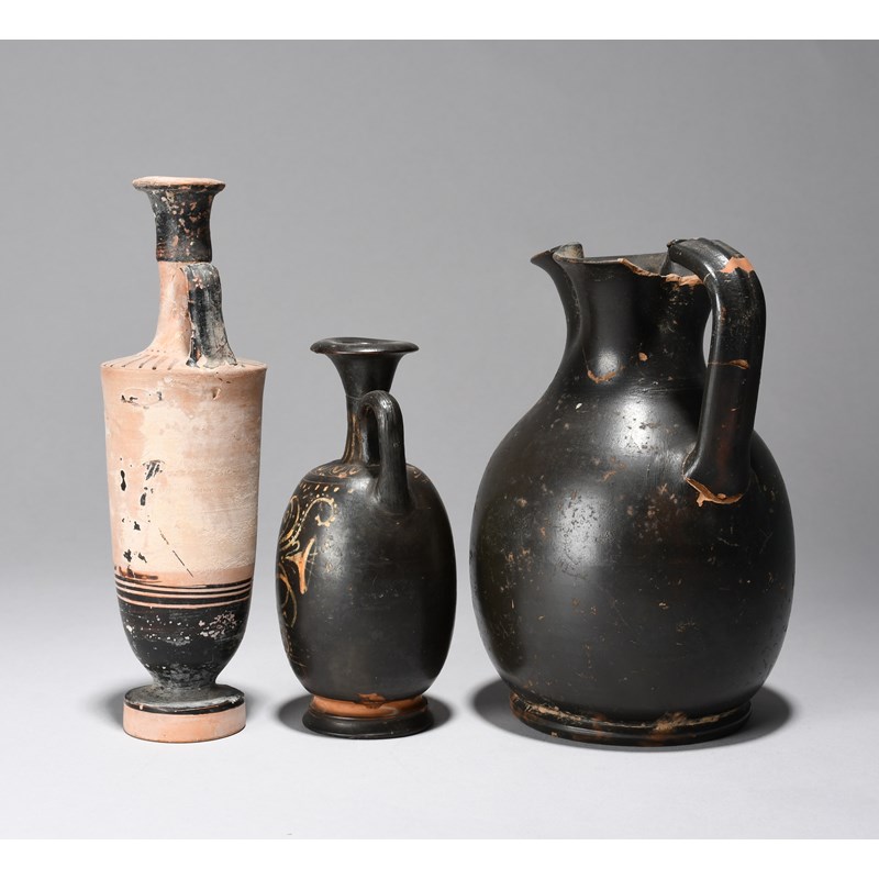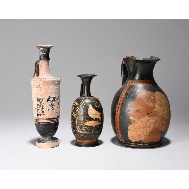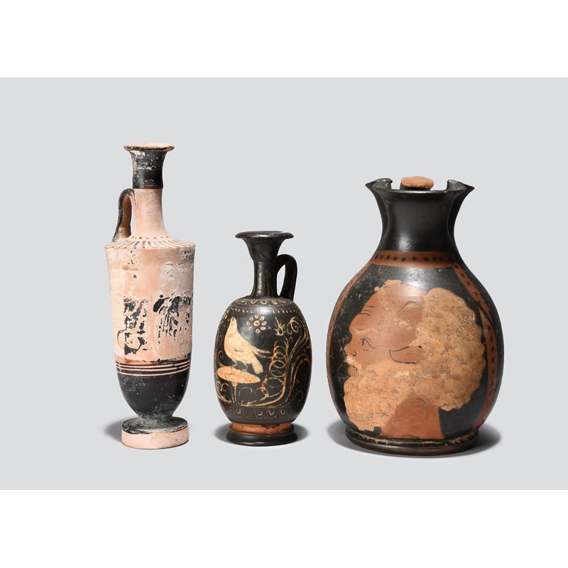 an Attic black figure lekythos, circa 5th century BC, with the remains of a quadriga scene, 18.5cm high and an Attic red figure oinochoe, circa 5th - 4th century BC, depicting the head of Sinenus, 16cm high. (3)