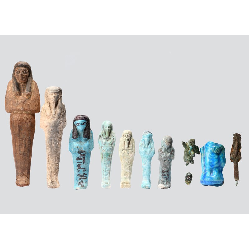 including a wood shabti, with painted face, wig and a necklace, the back with the remains of a bag, 21.7cm high, four blue composite shabti; two with painted hieroglyphs, 12cm and 8.2cm high, one with inscribed hieroglyphs, 11cm high, and one plain with a pillar back, 9.3cm high; a turquoise shabti with a pillar back, 9.4cm high and a 20th century shabti, 17.5cm high, together with an Egyptian blue glazed composite fragment figure, an Egyptian bronze amulet of Osiris, 8.3cm high, a small bronze cherub, probably Roman, 5cm long and a small millefiori glass flat bead, 2.2cm long. (11)