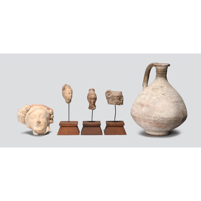 two Hellenistic pottery female heads, with their hair worn in a chignon,