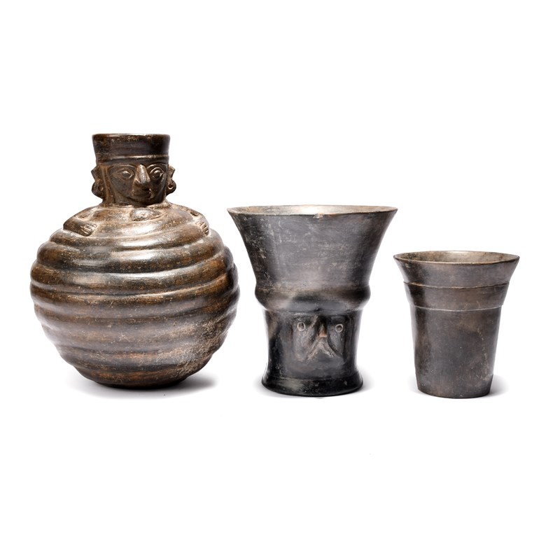 a Bolivia clay kero, 11cm high and another larger with a relief owl mask, 15cm high. (3)