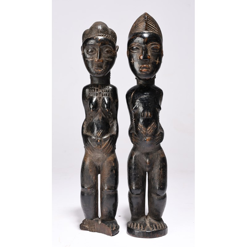 Two Baule standing figures Ivory Coast male and female with scarifications and hands placed on...