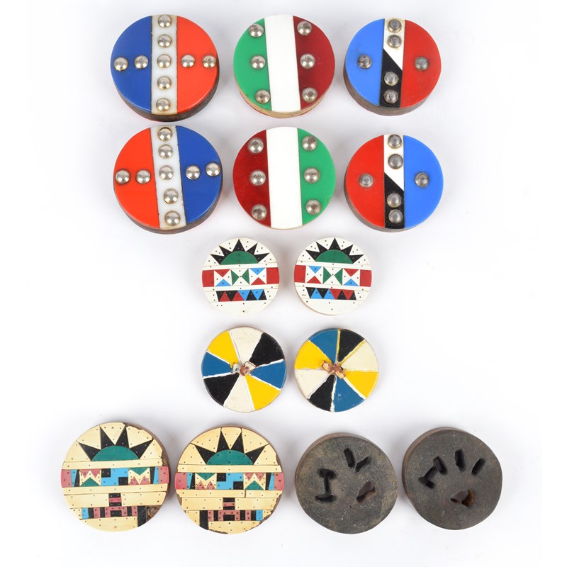 including a pierced pair, 6.5cm diameter, two single side pairs with geometric vinyl designs, 6.8cm and 5cm diameter, three with coloured plastic and tacks, 6.1cm, 6.5cm and 6.9cm diameter and a two part pair, tied together and with painted segments, 5.3cm diameter. (14)