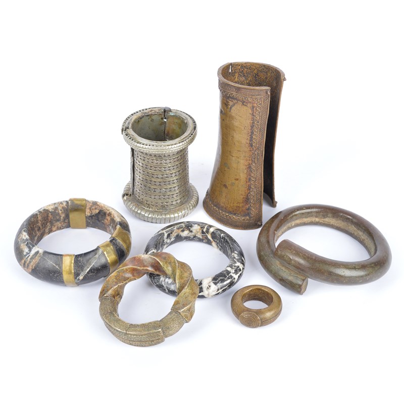 an Ibo bronze currency anklet, a Fulani brass bangle, a Guerre brass currency ring, a Bamileke brass cuff bracelet and a Nubian bracelet. (7)