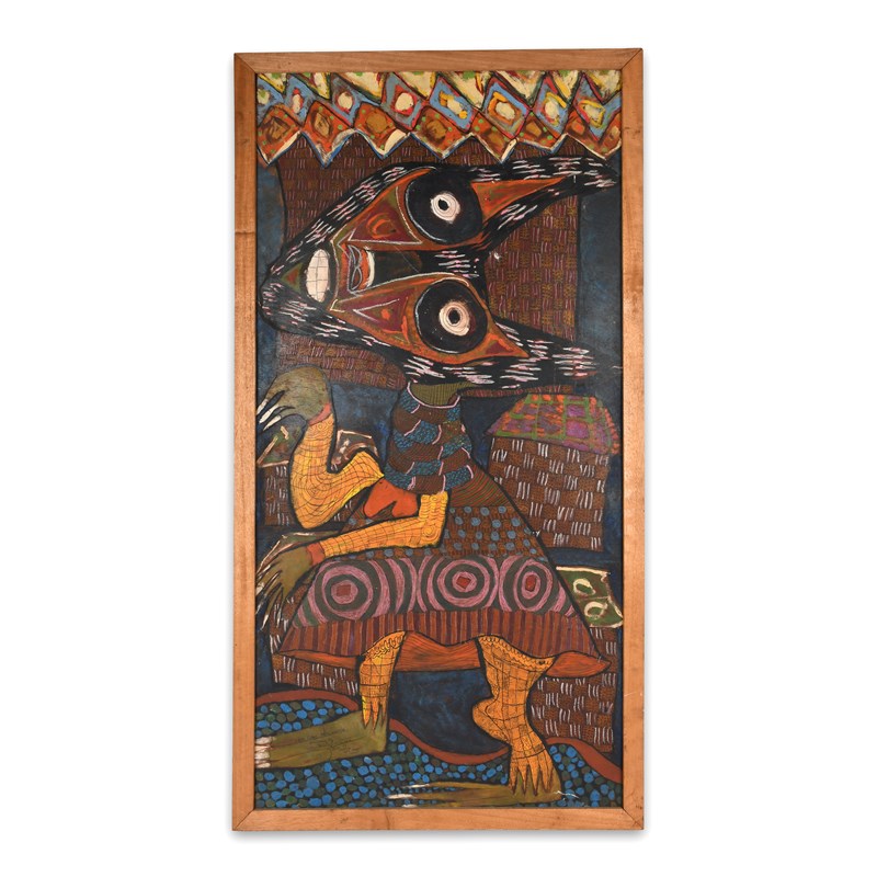 Prince Twins Seven Seven changed his birth name, Olaniyi Osuntoki, to signal his status as the sole surviving child of his parents' seven sets of twins. In the 1960's he discovered his artistic calling on joining the Oshogbo art school, where the myths of Yoruba culture, many recited by his mother were the subject matter of his works. Using ink and paint on large sheets of plywood, with the colours and patterns reminiscent of the traditional textiles.