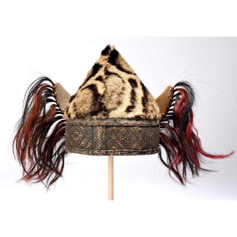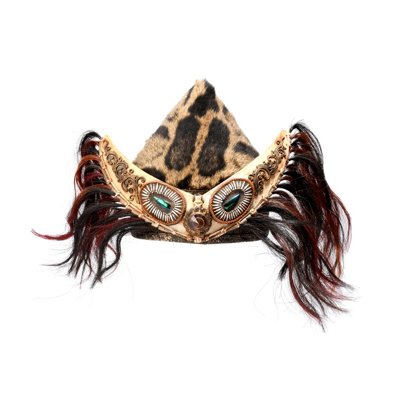 rattan, fibre and clouded leopard (neofelis nebulosa) skin with applied bone horns with applied 'tiger eye's' of shell and beetle elytrae, gilt mounts and central facet glass bead, edged with natural and red stained horse hair, early - mid 20th century,