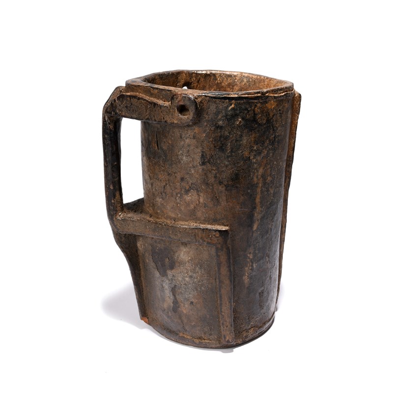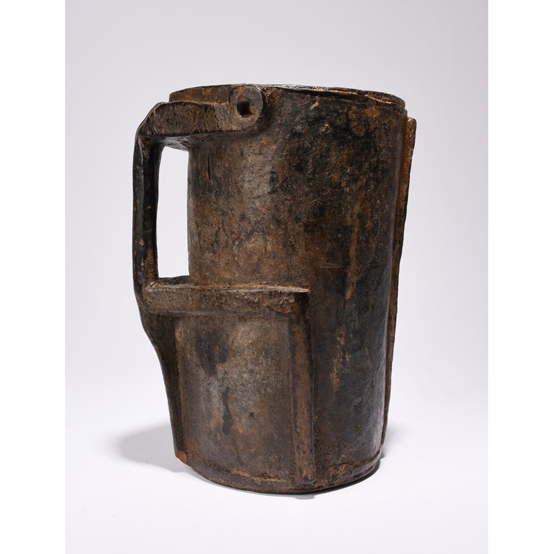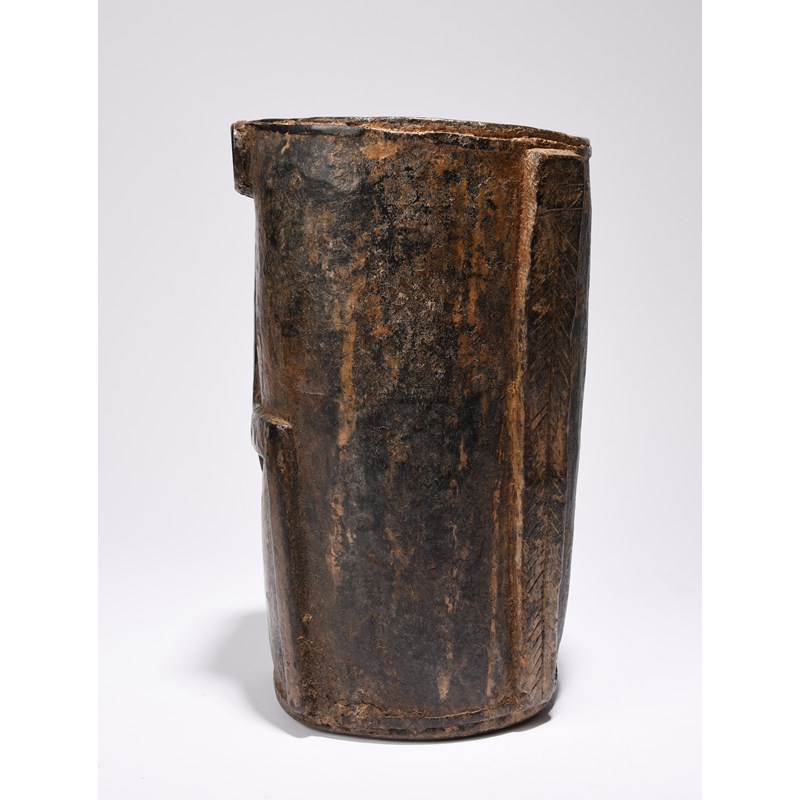 A Tibet milk pot with a zoomorphic handle and a vertical ridge to the front with incised linear...