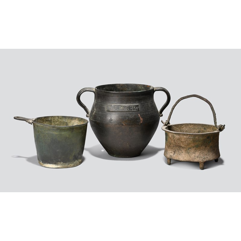 including a situla with one remaining handle, 12.5cm diameter, a pan with a short pierced handle having dolphin head terminals, the body later indistinctly inscribed Bolog.., 9.6cm high and a two handled ovoid jar, with an applied plaque cast F.U.M.C:P., 15.2cm high. (3)