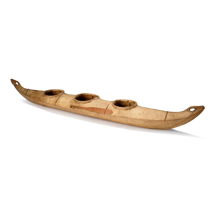 wood with sealskin and an oar, with typed identification label E-8 Alaskan Eskimo THREE-MAN KAYAK MODEL SEALSKIN AND CEDAR Turn of the Century,