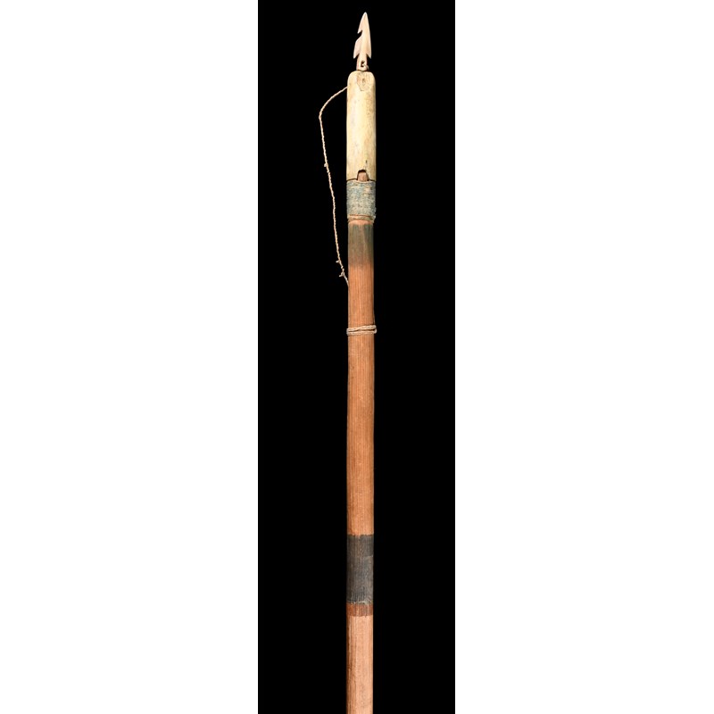 cedar, marine ivory, sinew and pigment staining, with a socketed head and detachable barbed tip, 19th century,