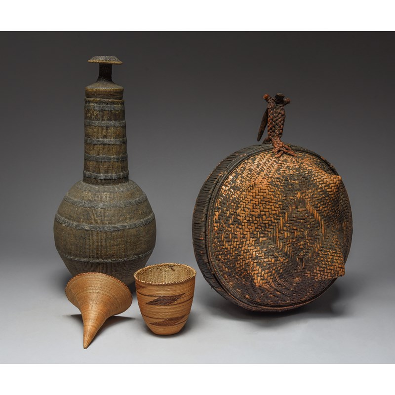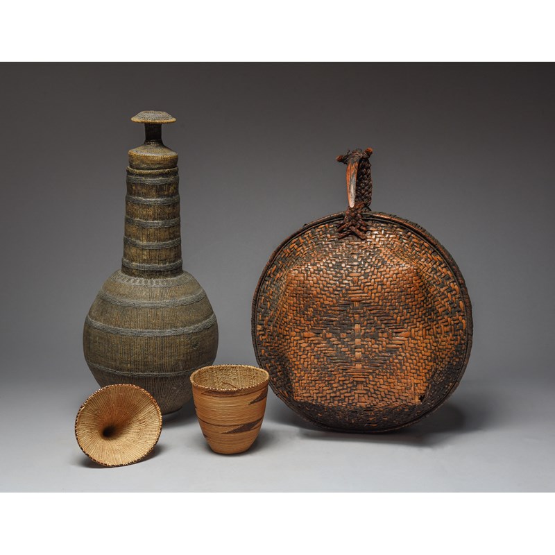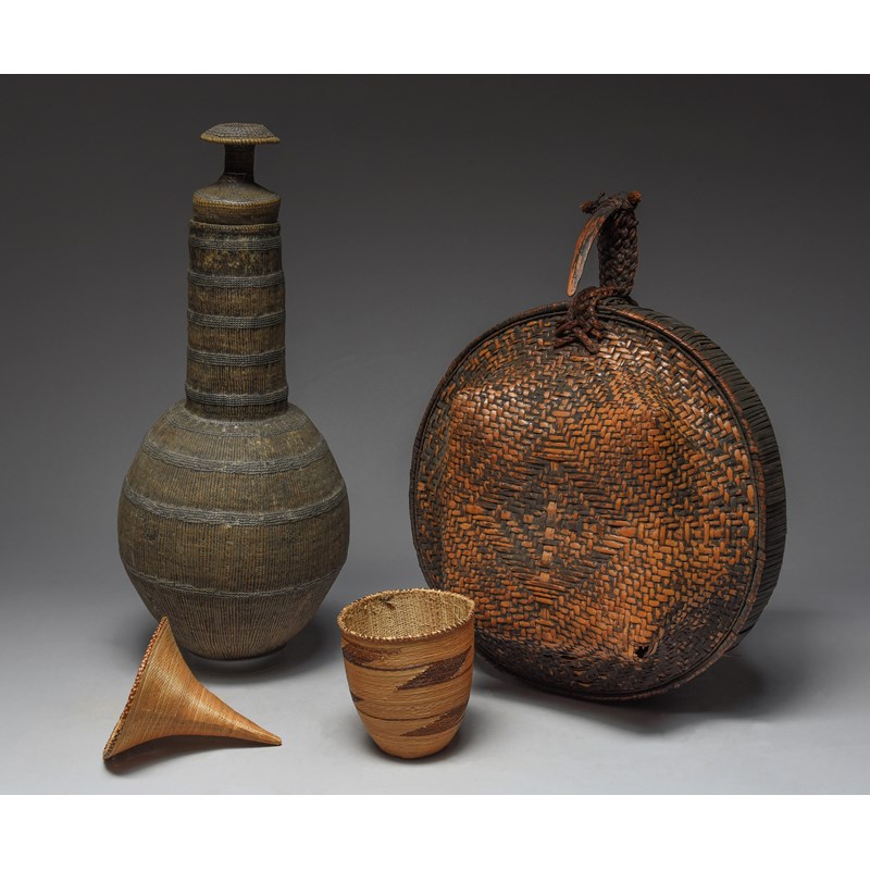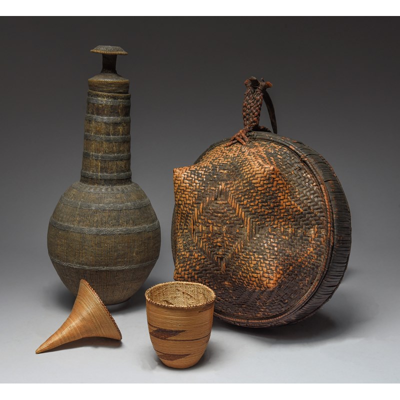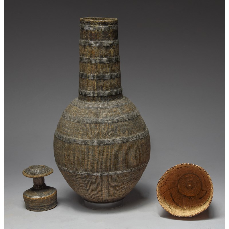 an Ethiopian milk pot and cover, natural fibre with wire inlay, 38cm high, and an Indonesian hinged circular container, rattan, fibre and bamboo, 25cm diameter. (5)