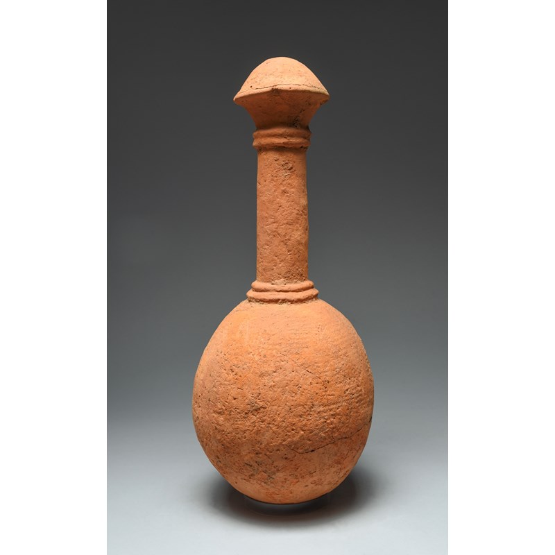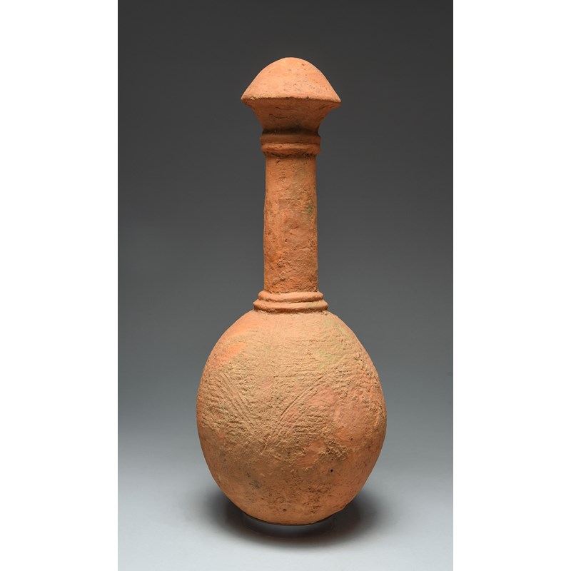 terracotta, with linear patterning to the body, a ringed cylindrical neck and a domed finial,