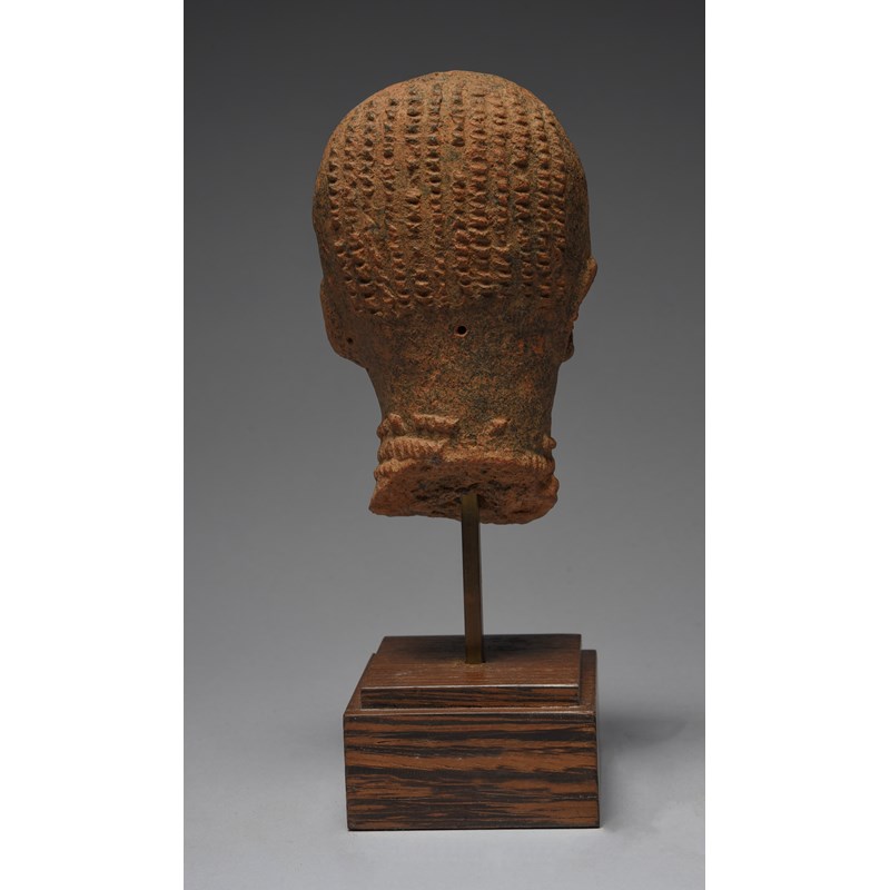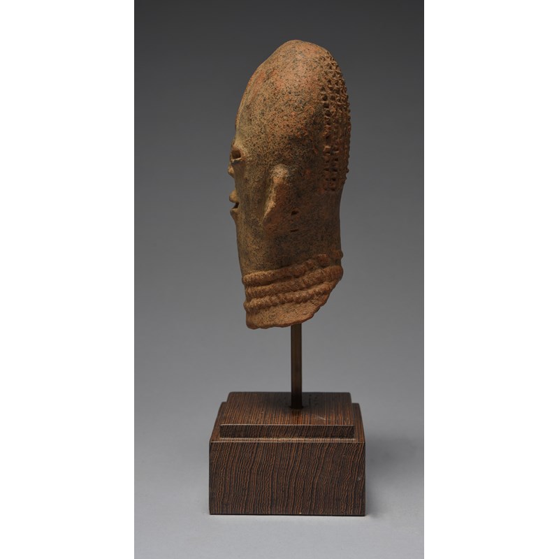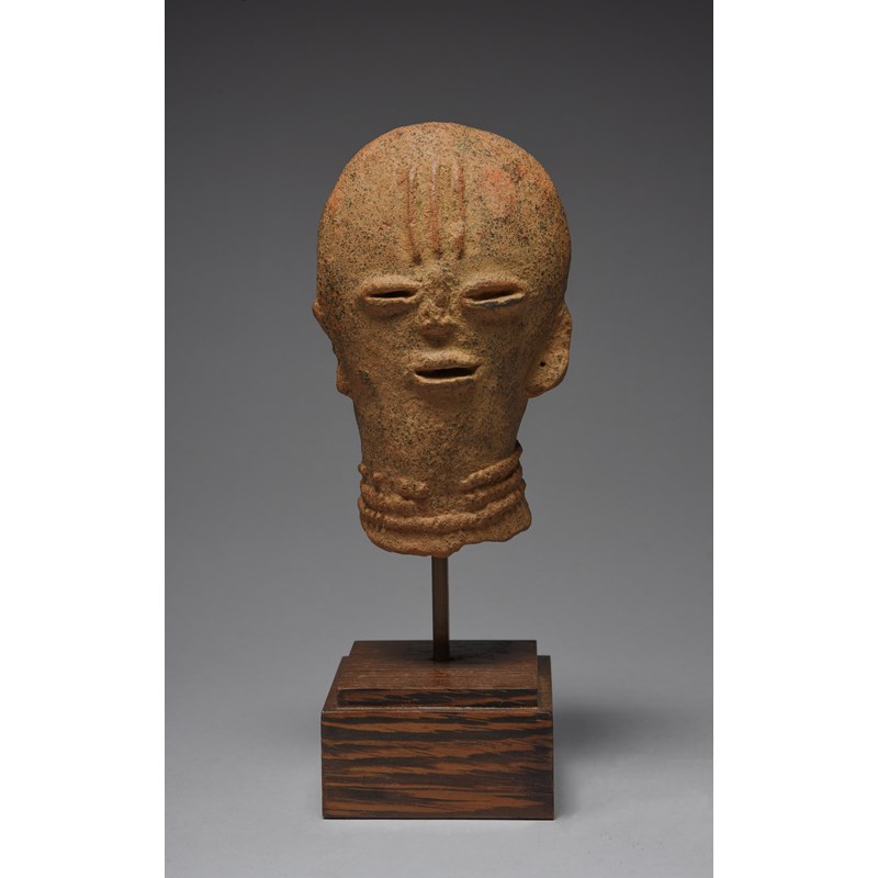 terracotta, with three relief scarification lines to the forehead, a ribbed coiffure, slit eyes and mouth with a triple ribbed necklace,