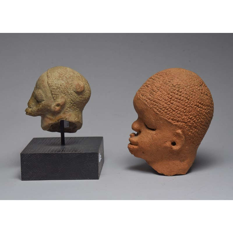 a larger Katsina pottery head, with a diced coiffure and a lip plug, 17.5cm high. (3)