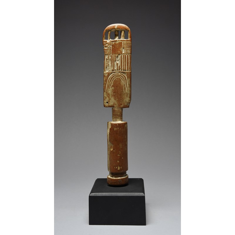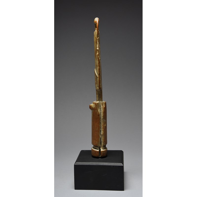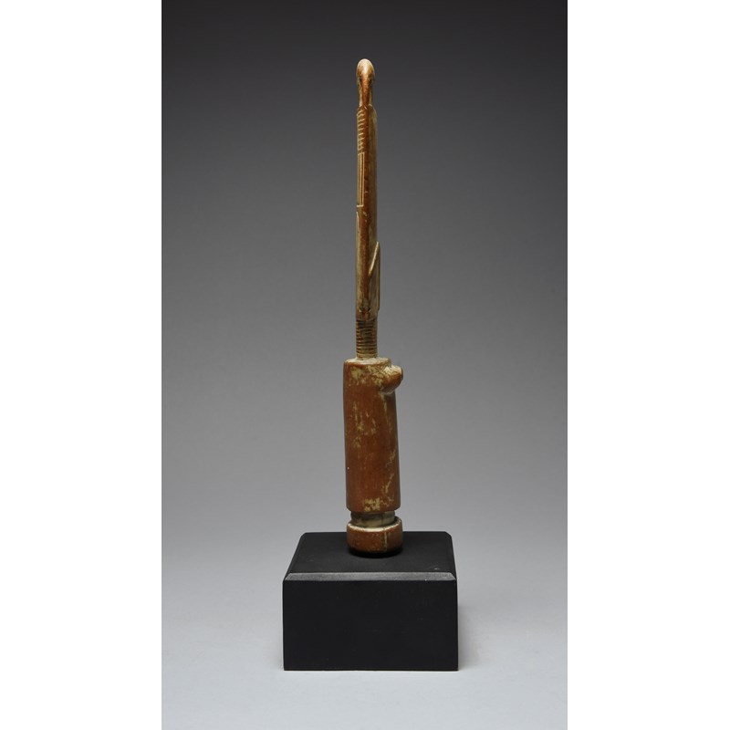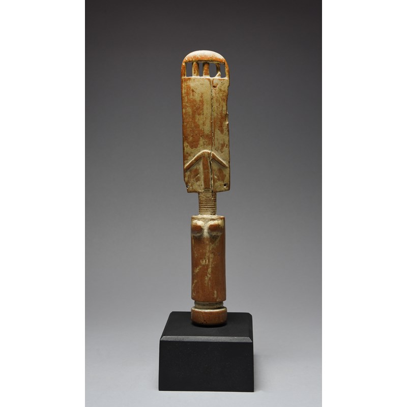 the head with a pierced top and with carved arched and straight linear decoration to the back and with a ringed neck, with kaolin,