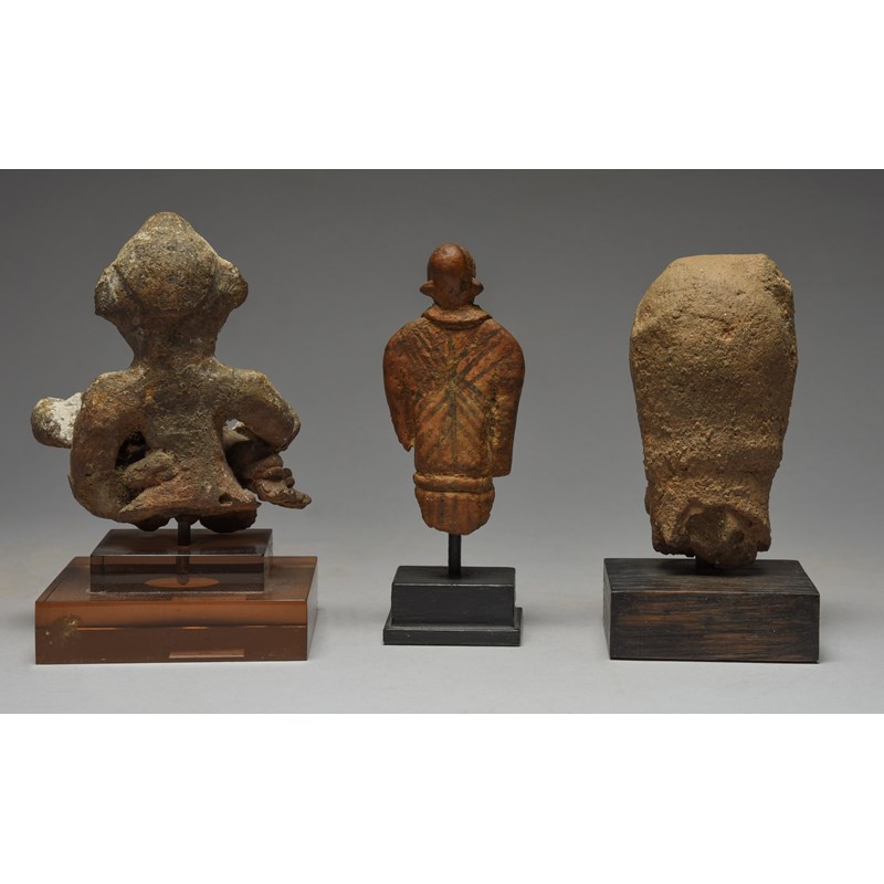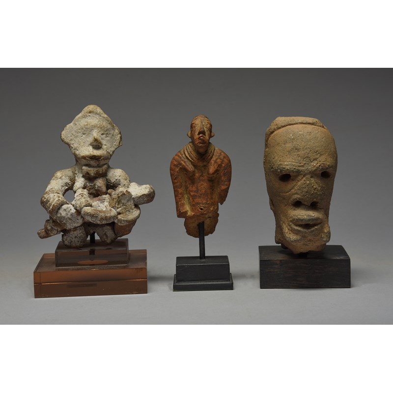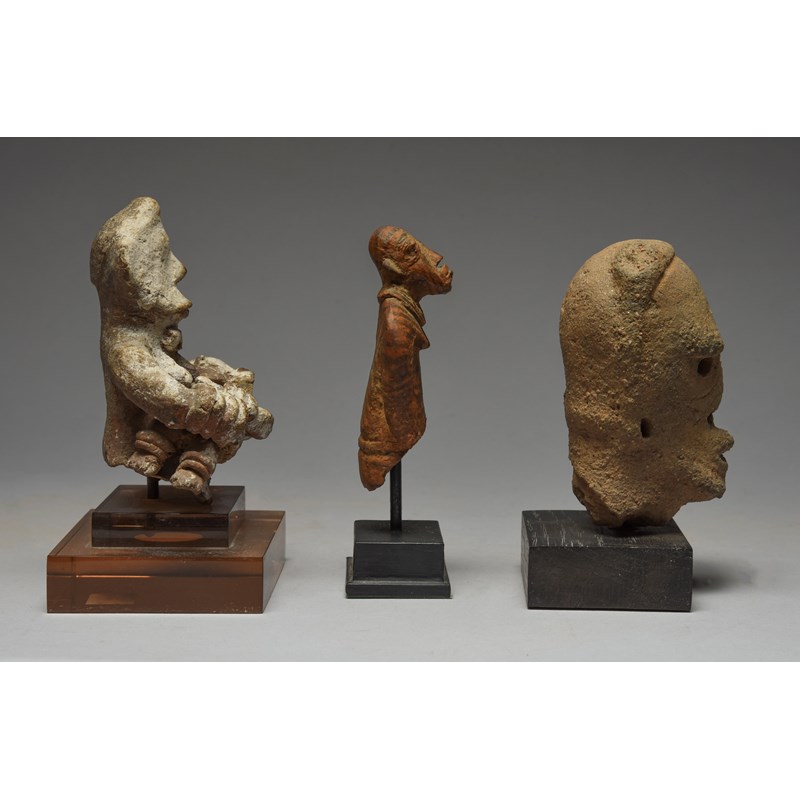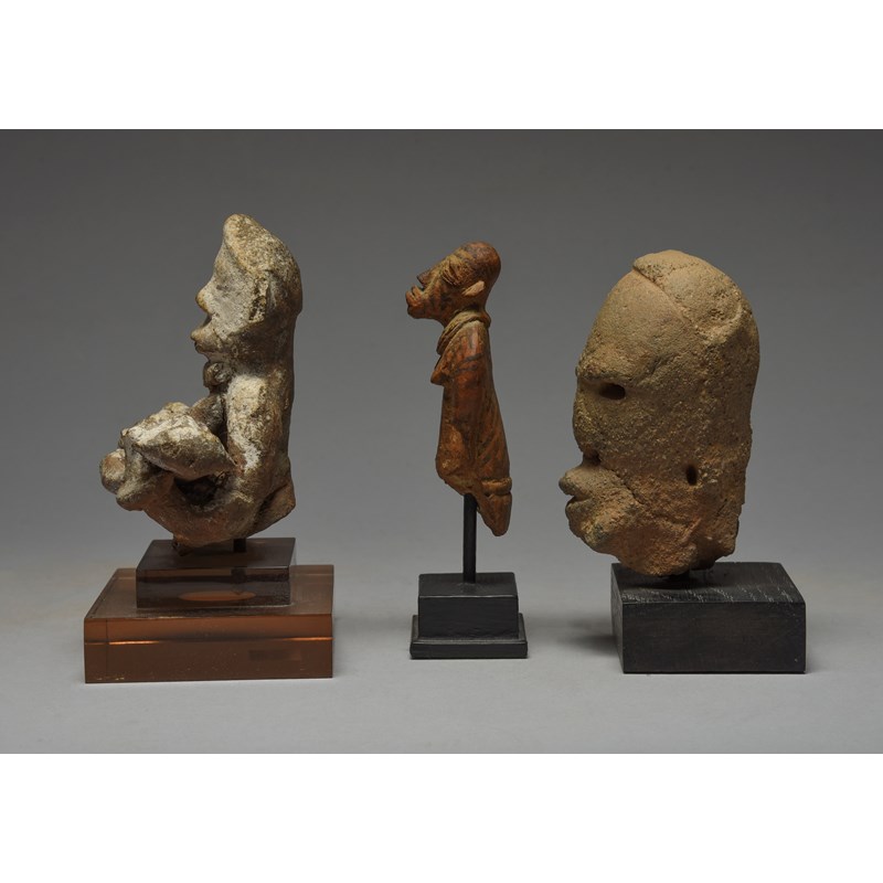 an Igbo pottery maternity figure fragment, with white pigment to the front, 10.7cm high, on a stand, and a Nok pottery head, 10cm high, on a stand. (4)