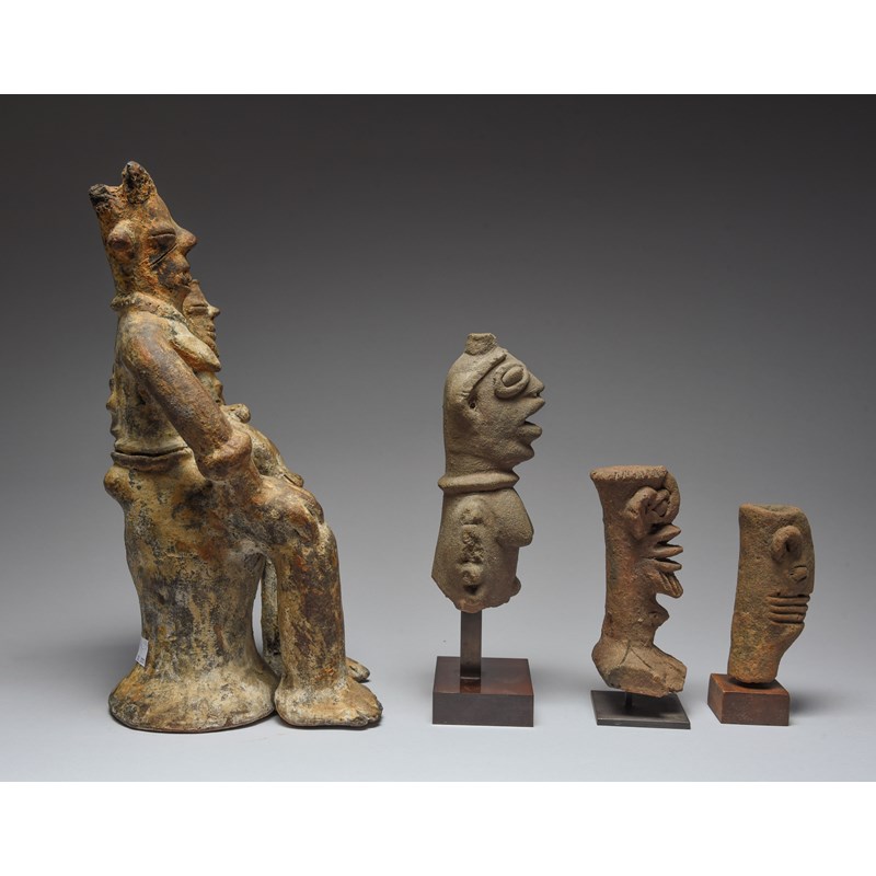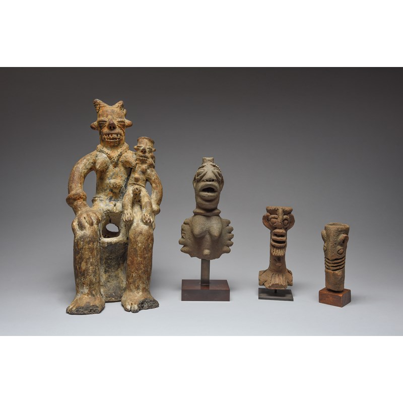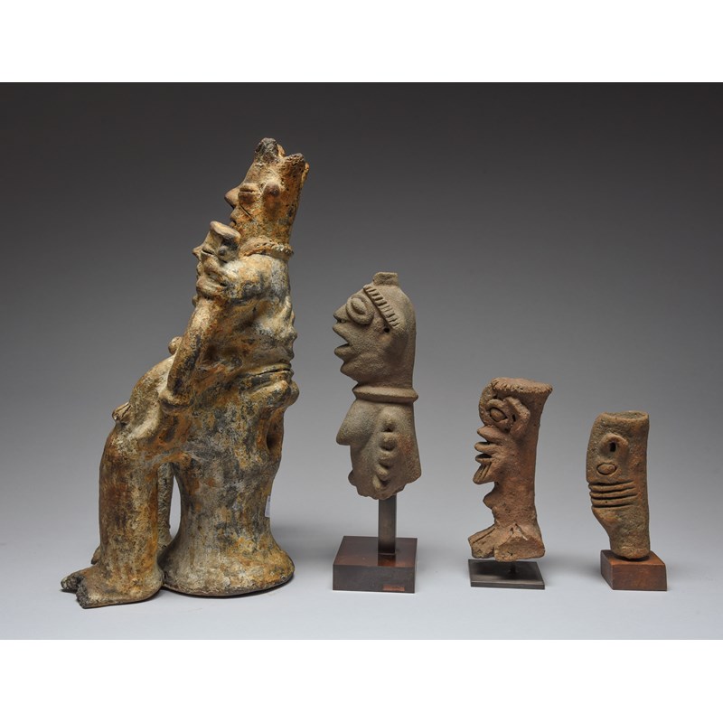 and three Nigerian pottery heads, 11cm, 14cm and 17.5cm high, on stands. (5)