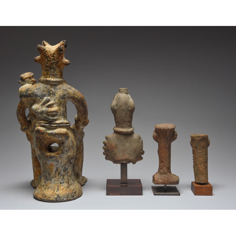 pottery, seated on a spool shape stool, supporting a child on her left thigh,
