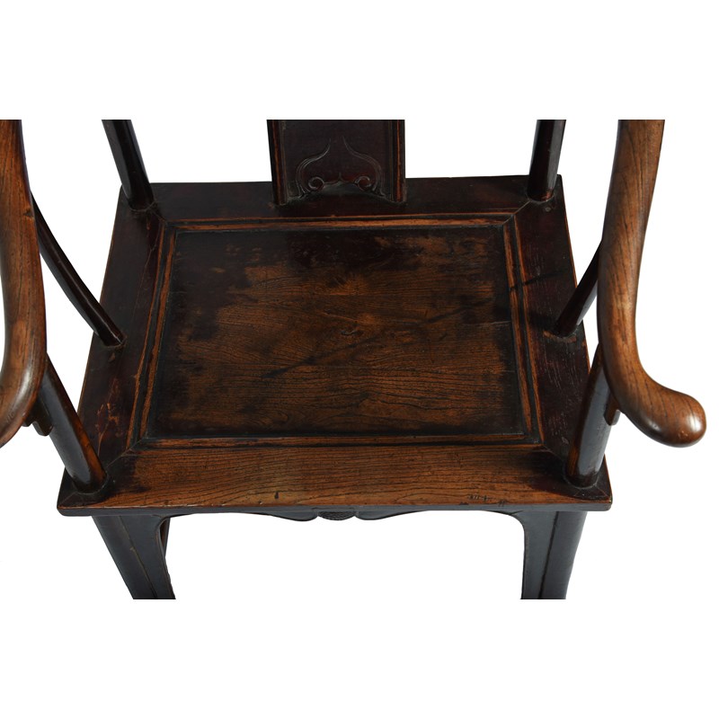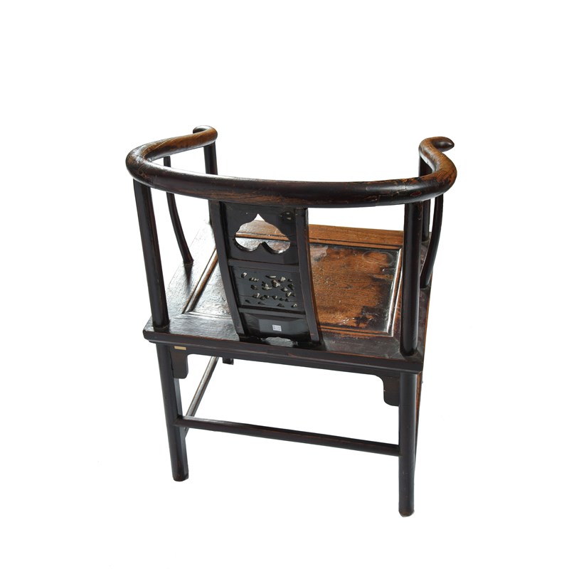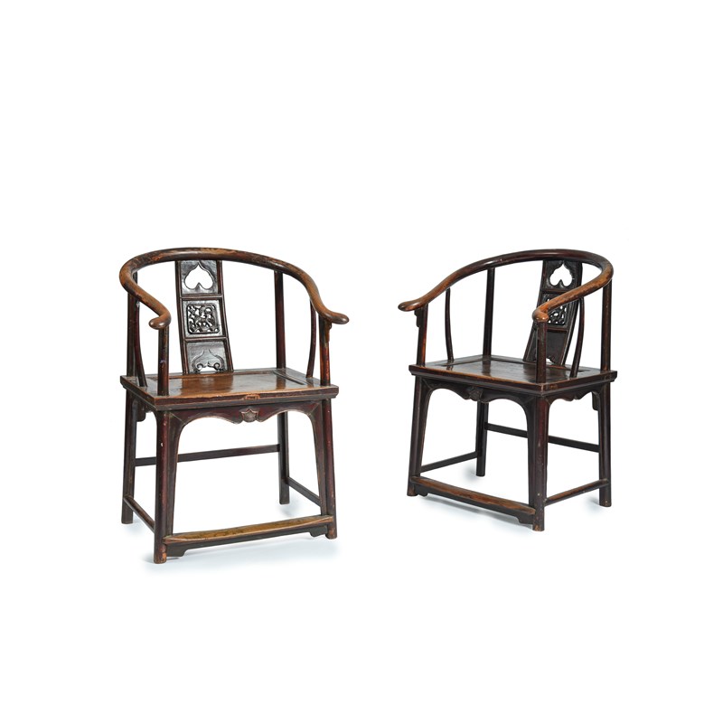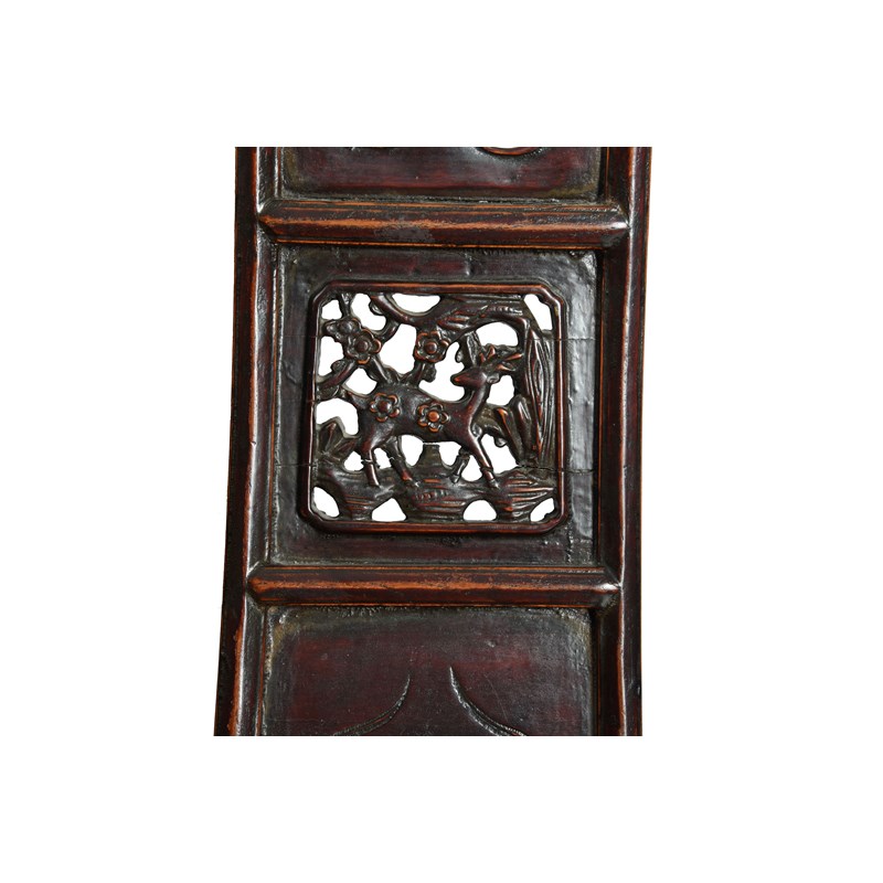 elm with remains of lacquer, each having a panelled splat with the central one pierced and carved with a differing deer amidst prunus, one with a stag with his head turned back to the left and the other a doe with her head turned back to the right, to a panel seat and arched framed legs,