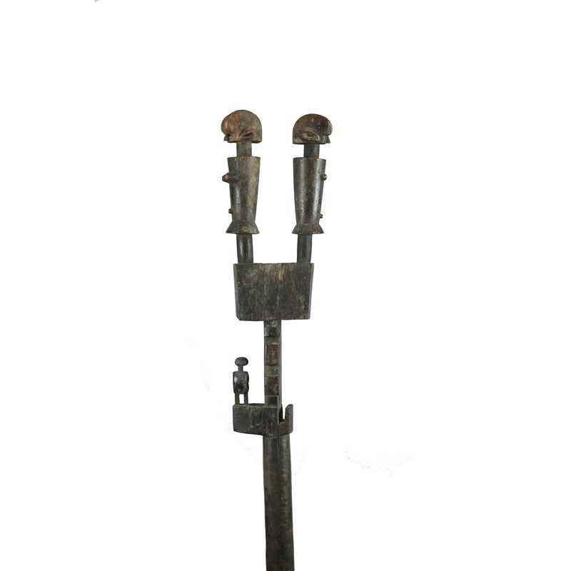 with two female figures, having inset bead eyes, on block and notched supports, to a protruding platform with another smaller standing figure and a hook, the shaft with a tapered base,