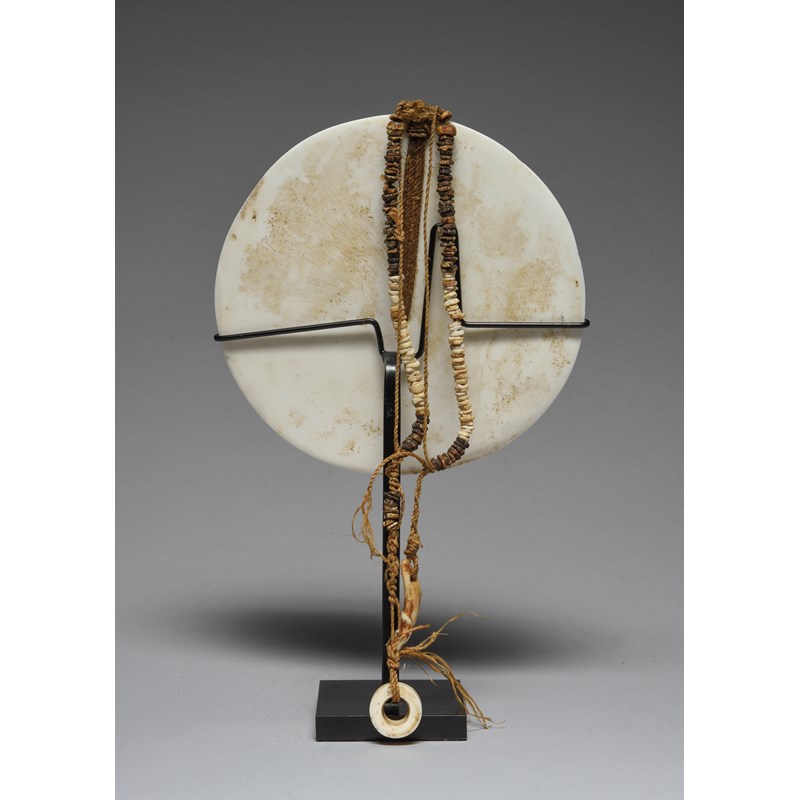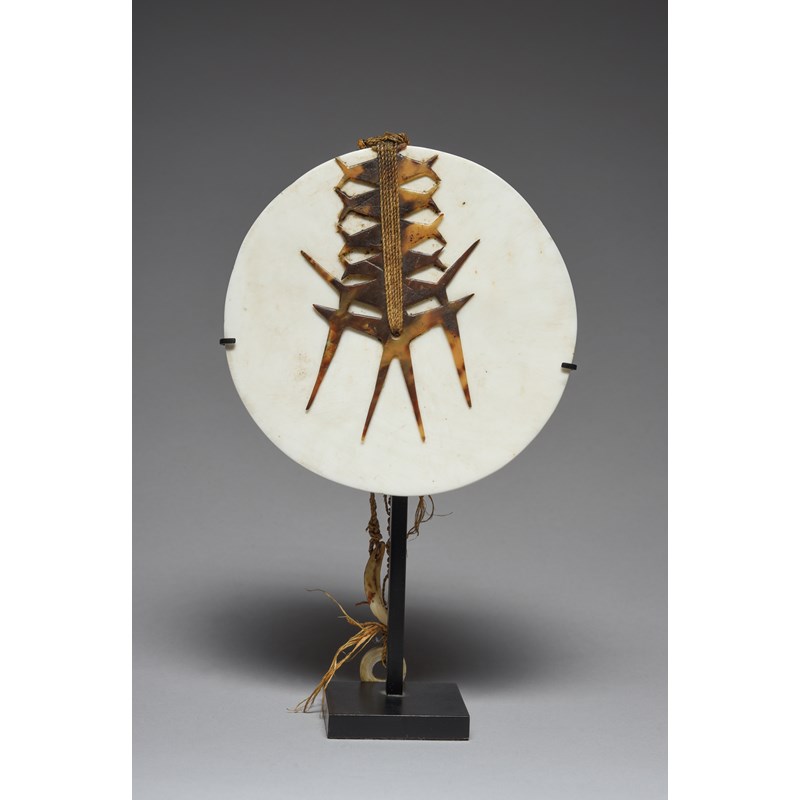 shell, turtleshell and fibre, carved stylised fish and a frigate bird, with two strands of shell discs, one with a dog tooth,