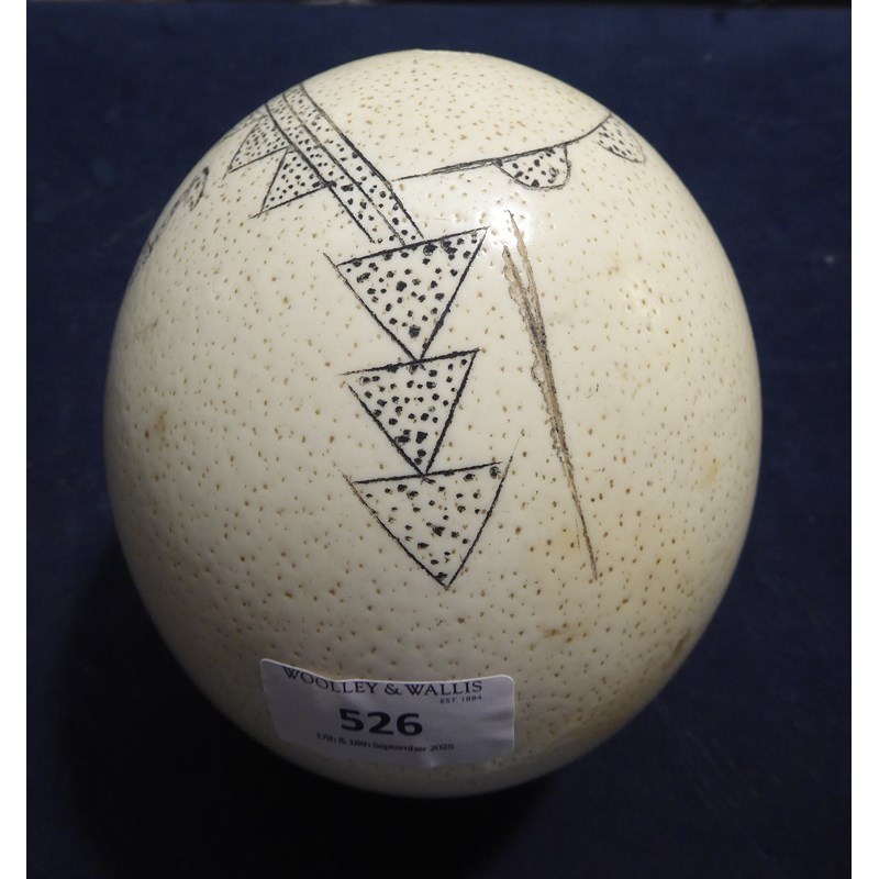 with incised and ebonised an ostrich and chick, with triangle, linear and semi-circle decoration,