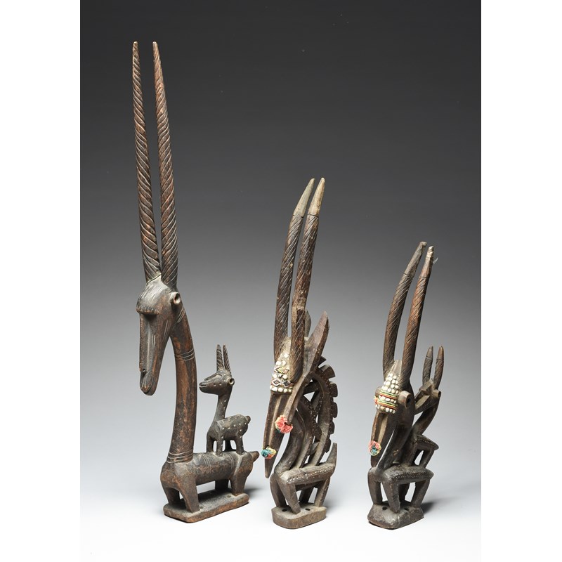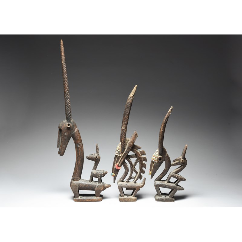 and a pair of Bambara antelope headdresses, with shell, bead and cotton decoration, 58cm and 48.5cm high. (3)