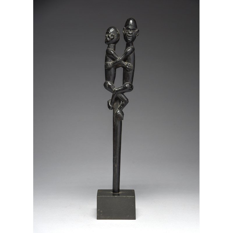 carved a pair of embracing figures, one with their head turned and looking backward and the other to their left, on a tapered shaft,