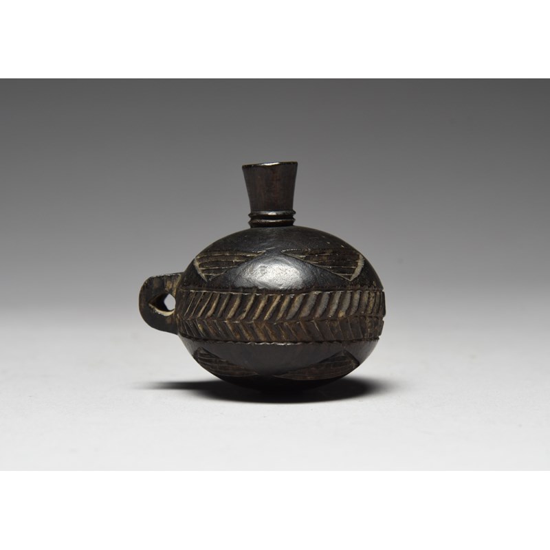 spherical with carved chevron and triangle linear decoration, with a flared neck, pierced side handle and a plugged base,