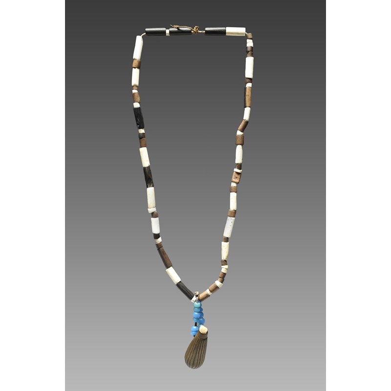 horn of ribbed tapered ovoid form with an integral loop handle, with a sinew and blue glass bead loop, attached to a wood and shell tube bead necklace,