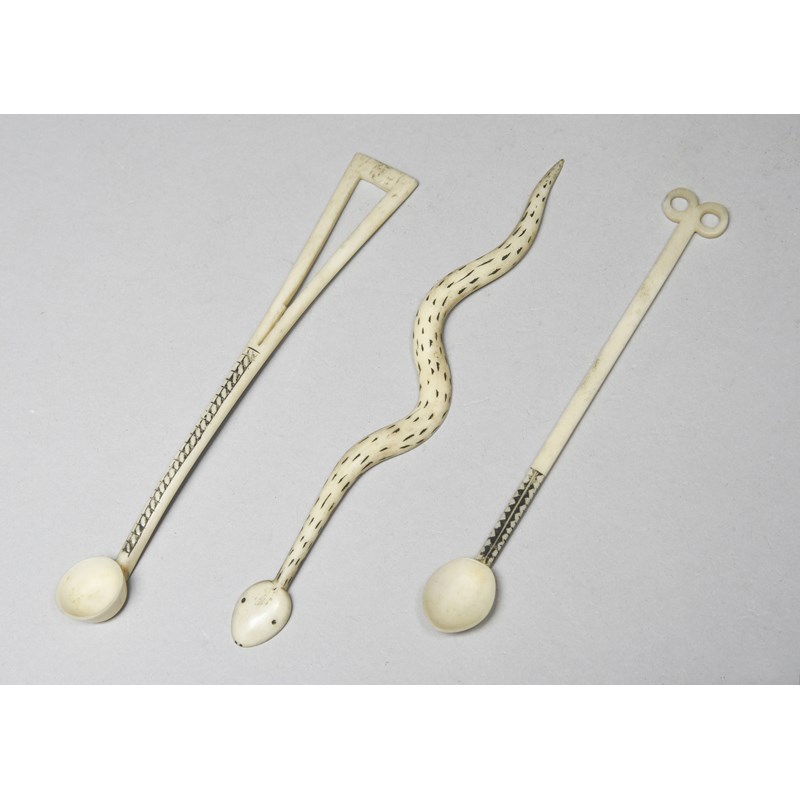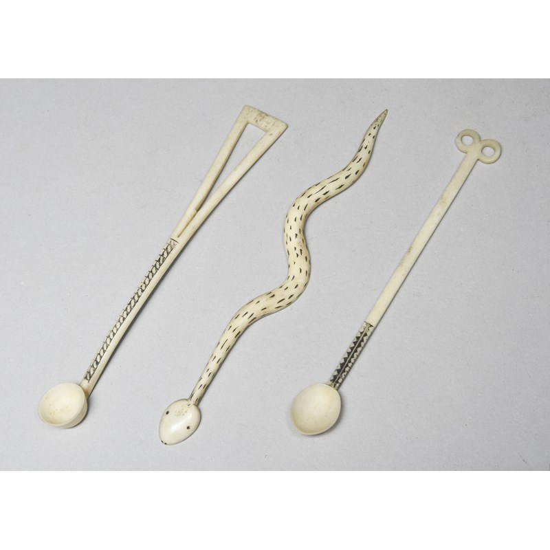 bone, including one carved as a snake, with incised and blackened decoration to one side, 14.7cm, another with an open flared terminal handle with incised and blackened decoration to both sides, 13.9cm long, and the third with a double ring terminal handle, with an incised band of blackened decoration, 13cm. (3)