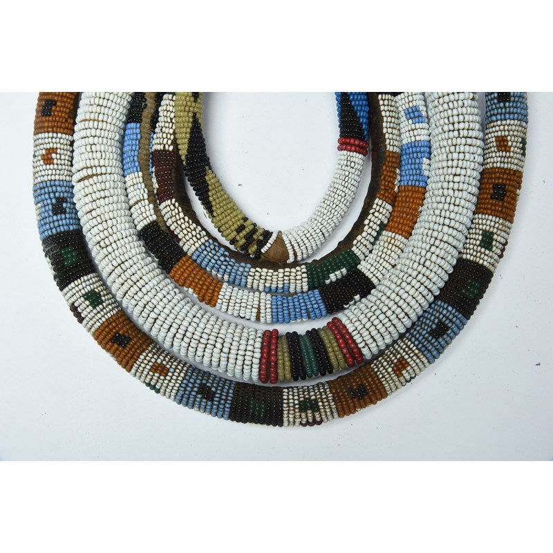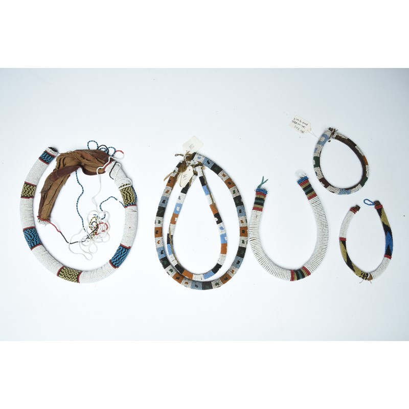 three Zulu similar beaded necklaces, the smaller with two brass buttons, 15cm, 19cm and 27cm. (6)