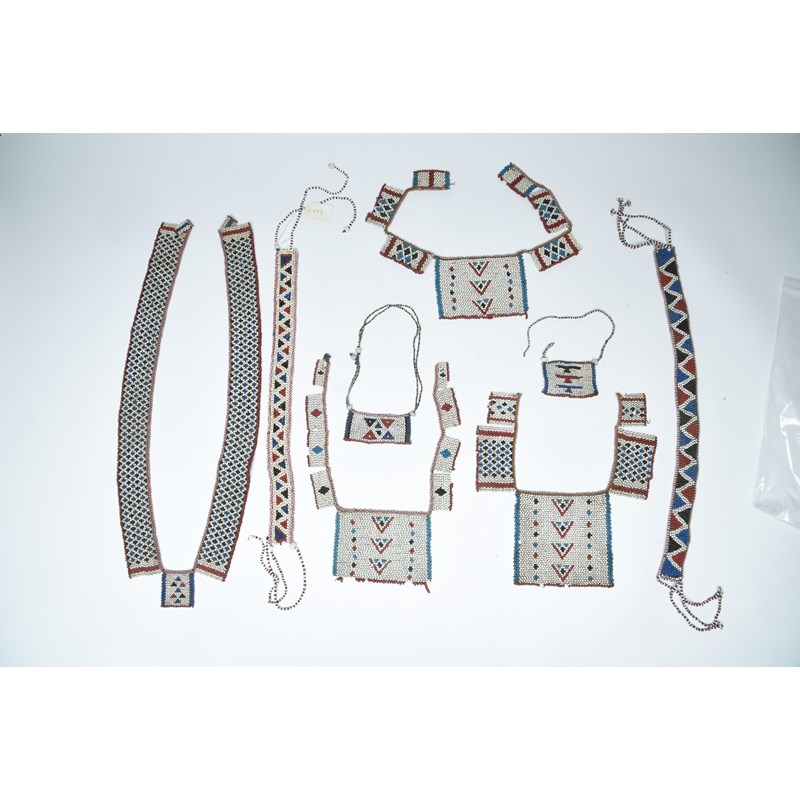 a Xhosa beaded long panelled neckpiece, 56cm long, two Xhosa beaded panel necklaces, 20.5cm and 15cm long, and two South Africa beaded headbands, 72cm and 85cm long. (8)
