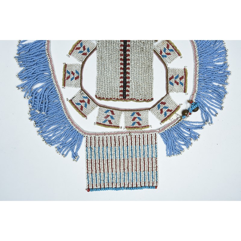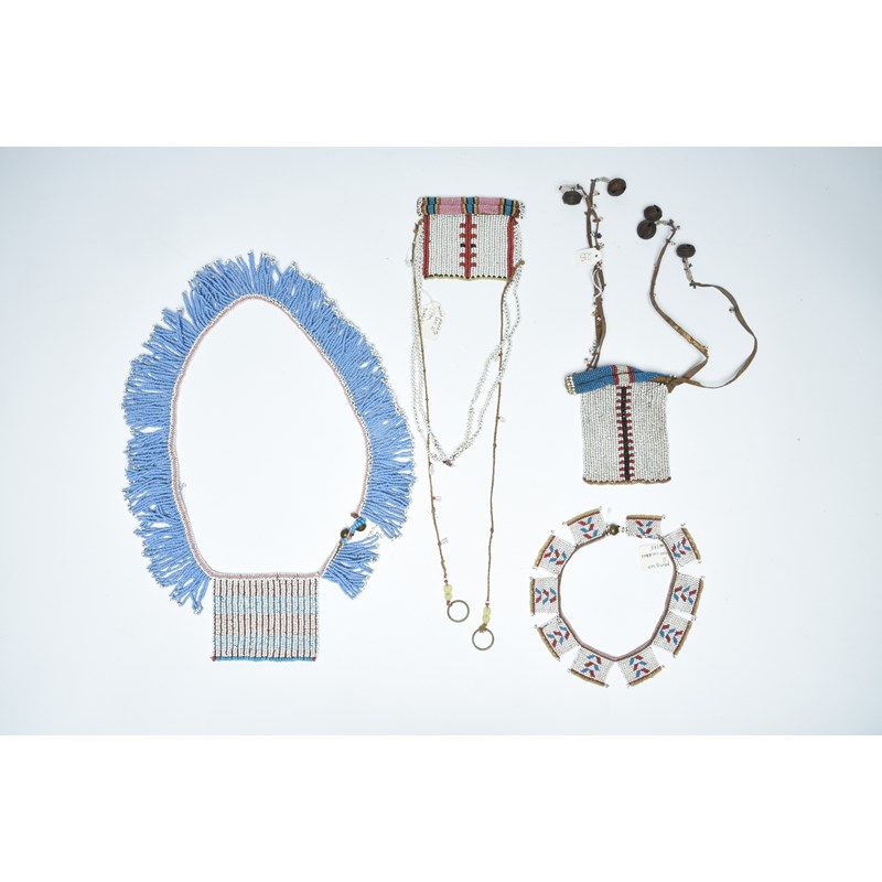 a Zulu ten panel beaded collar, with a brass button, 42cm long and two Zulu panel neckpieces / cache sexe, with twin cylinder tops, one with bead and fibre strings with brass rings and the other with beaded leather straps with metal bells, 9.5cm and 13.5cm high. (4)