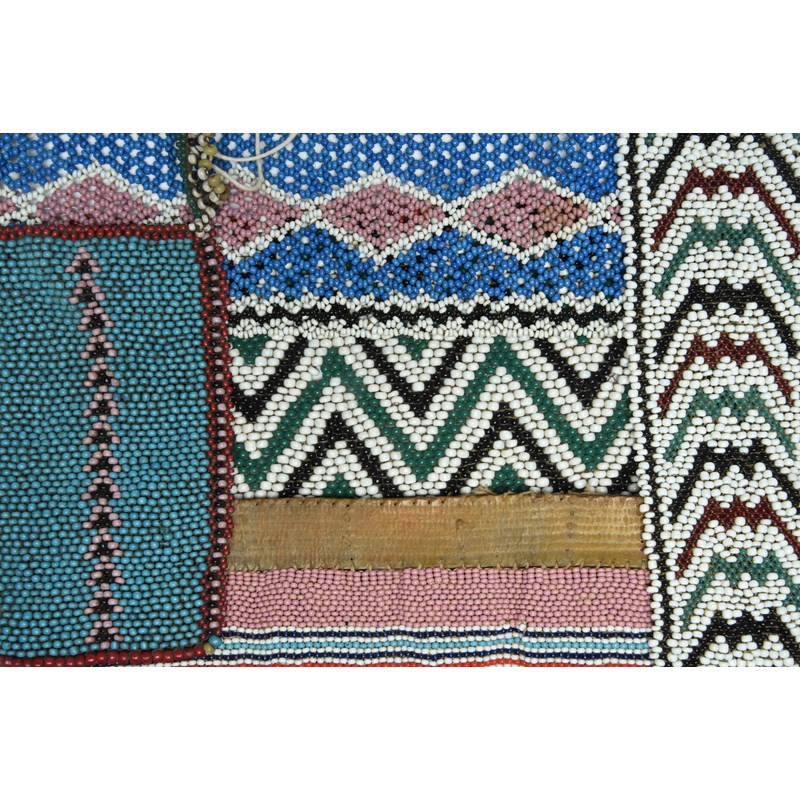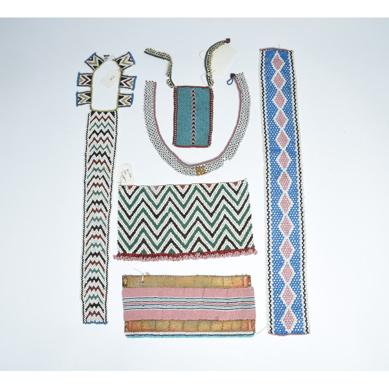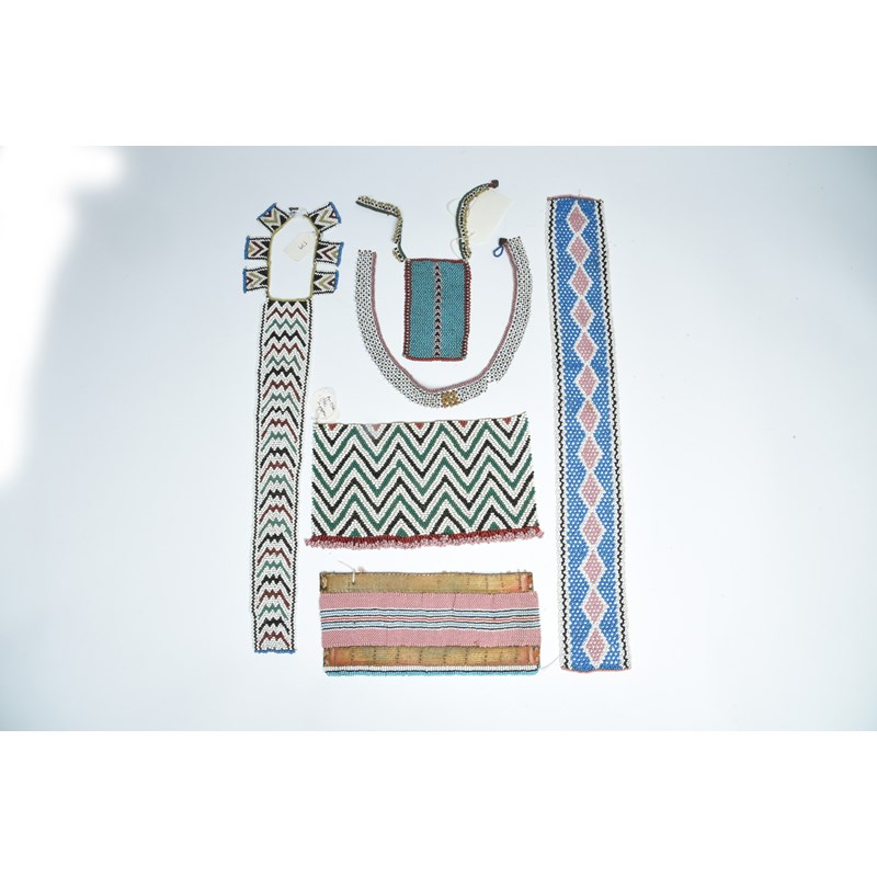 a Xhosa beaded and leather armband, 25cm long, a Zulu beaded panel, with zig-zags, 27cm wide, an Xhosa beaded panel, 60cm long, a Zulu neck panel, with a brass button, 27cm long, and a Zulu beaded neck collar, with a brass button, 47cm long. (6)