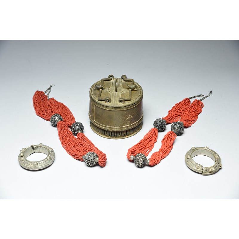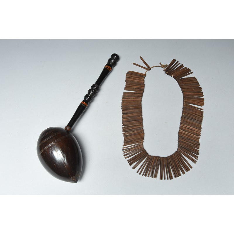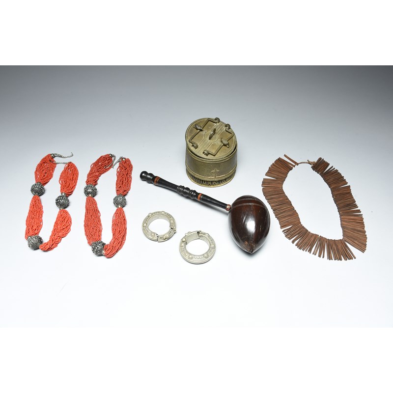 a coconut ladle, with a turned lacquer handle, 29.5cm long, two Omani glass and silver coloured metal bead necklaces, 72.5cm and 75.5cm long, a pair of cast metal bracelets and a Zulu wood necklace, 29cm long. (8)