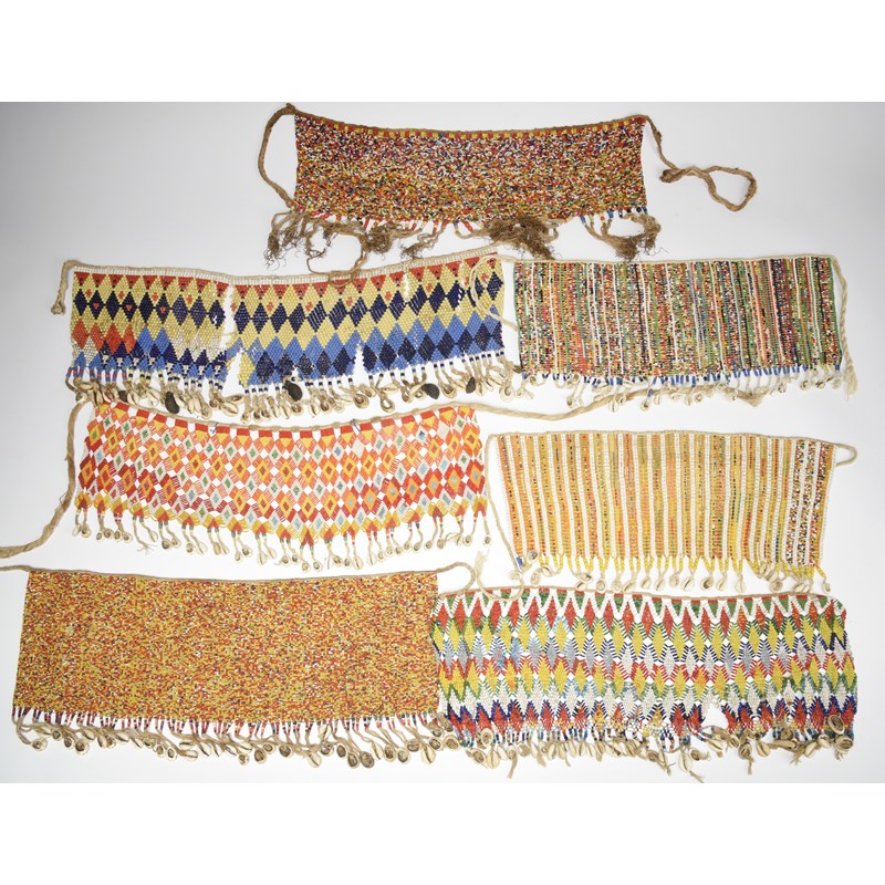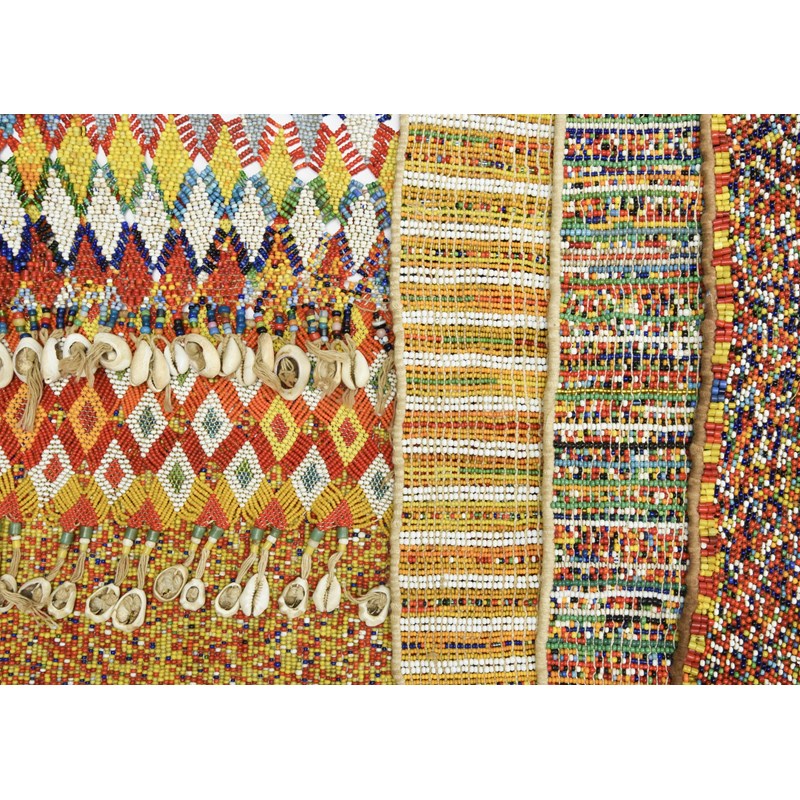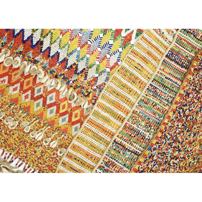 fibre and coloured glass beads, six with cowrie shells,