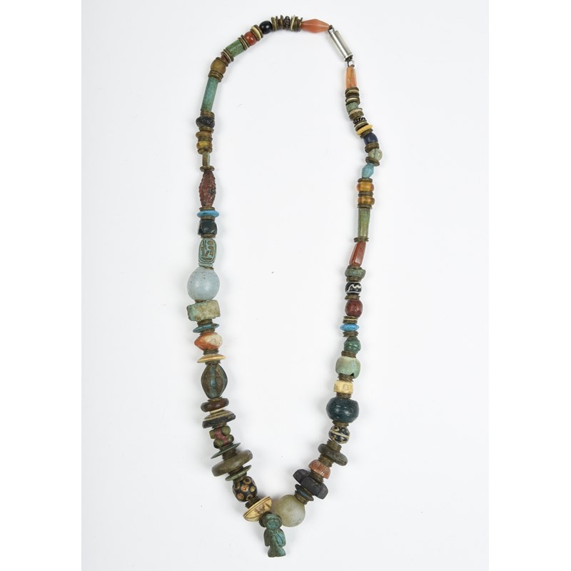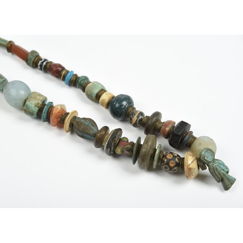 glass, agate, bone, brass and faience, including a tyet amulet, another with hieroglyphs either side, with brass discs, the tube clasp incised RK,