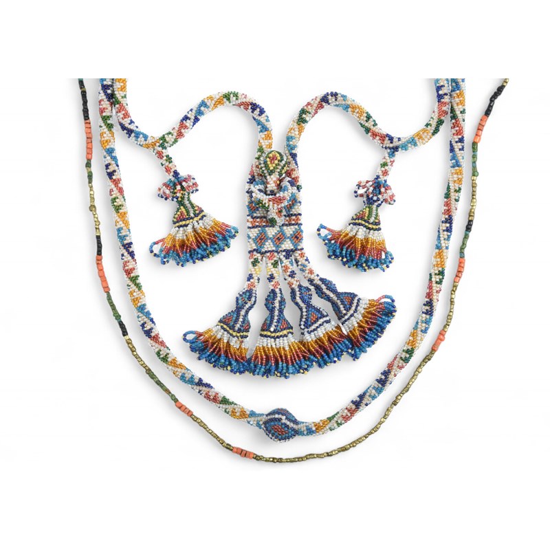 and an Afghanistan glass, brass and coral bead necklace, with a button end, 51cm long. (2)