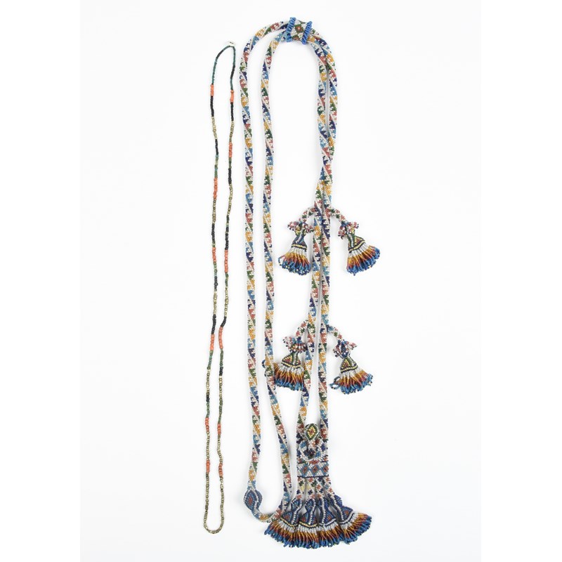 coloured glass, with tassels and a toggle to the lower panel and a sliding toggle above, with a swollen bead to the top,