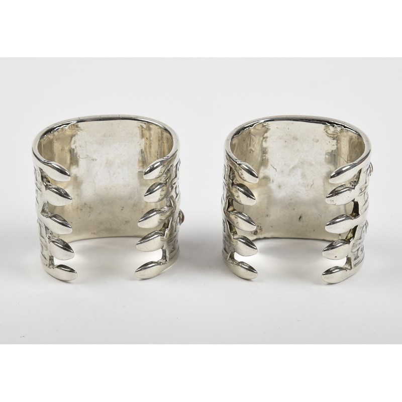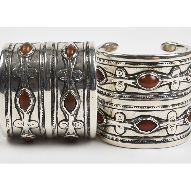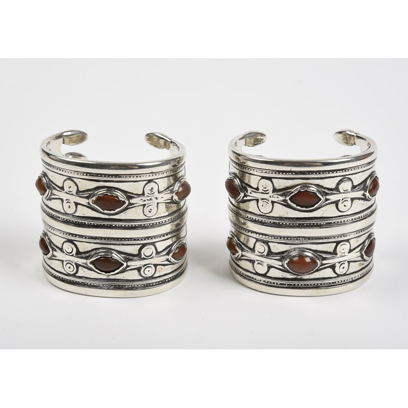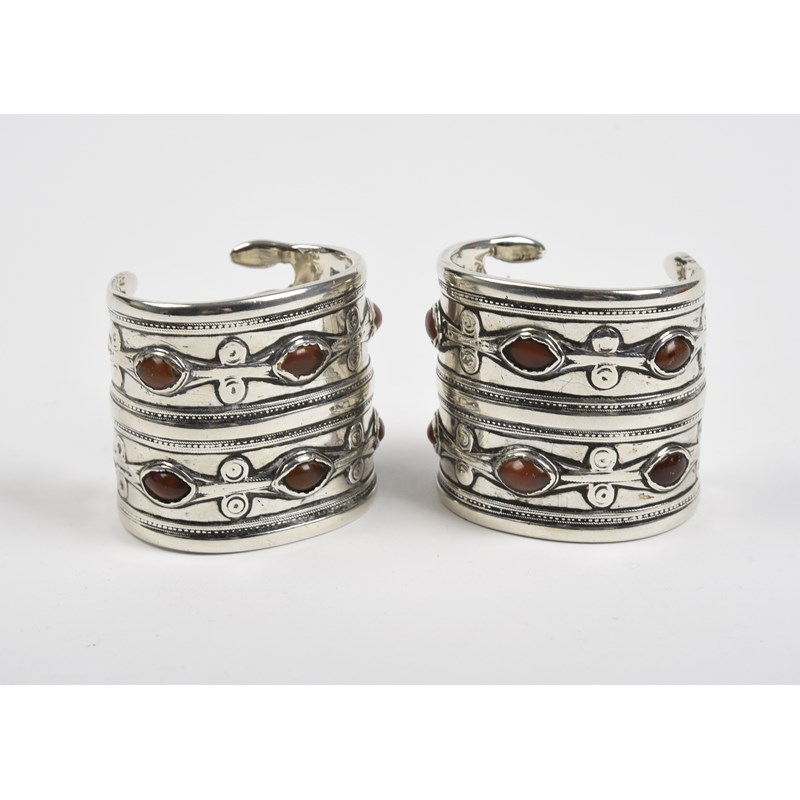 silver coloured metal with two bands of relief decoration with inset carnelian beads, and five pendant drop shapes to each end,