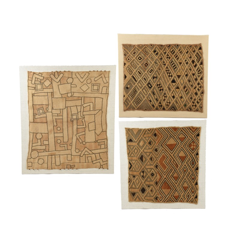 and a Kuba skirt fragment, raffia with abstract designs, two edges with pompoms, 89cm x 71cm, all mounted. (3)