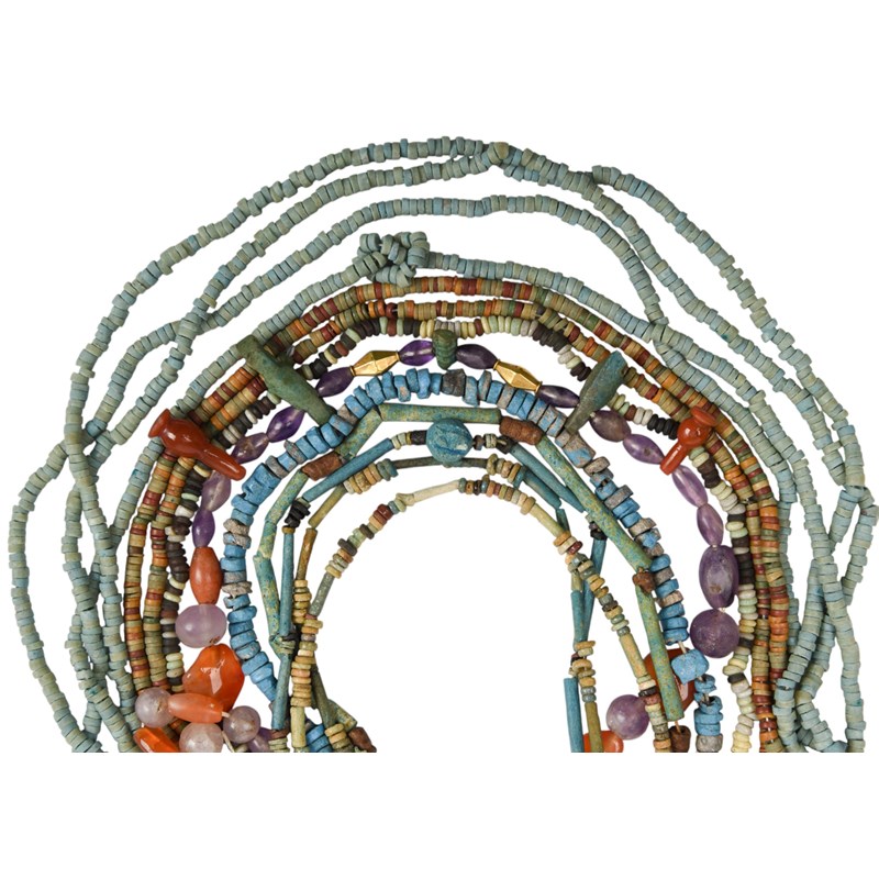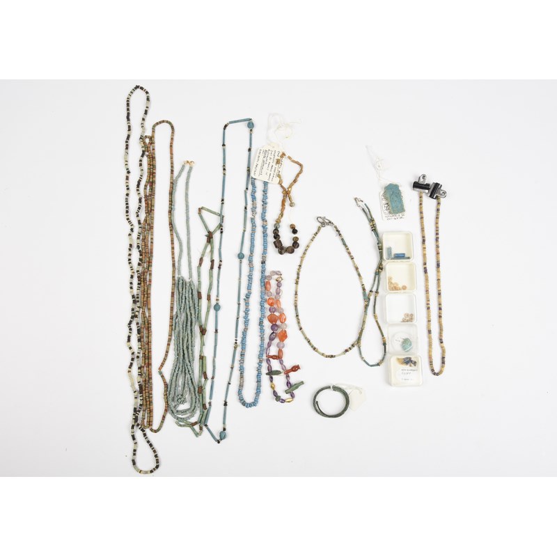 an agate bead necklace with three Eygptian faience amulets and two poppy flower amulets, 18cm long, various strung gold foil beads, two Romano-Egyptian millefiori glass fragments and an Islamic inscribed navette shape bead.