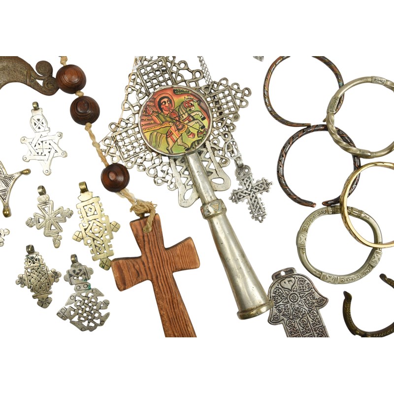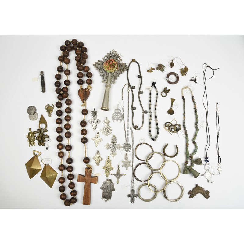 an Ethiopia processional cross, with painted rondals, 26cm high, eight African metal bangles, seven Mali rings, a bronze faceted and diced end bead, 9cm long, a bronze fruit shape bead, 2.7cm long, a Dogon brass bird head pendant, 2.6cm long, a pair of Moroccan brass camel ornaments, 11.5cm long, a Mali metal bead necklace with three bell pendants, 38cm long, two Maria Theresa thalers, and other necklaces and pendants. (qty)