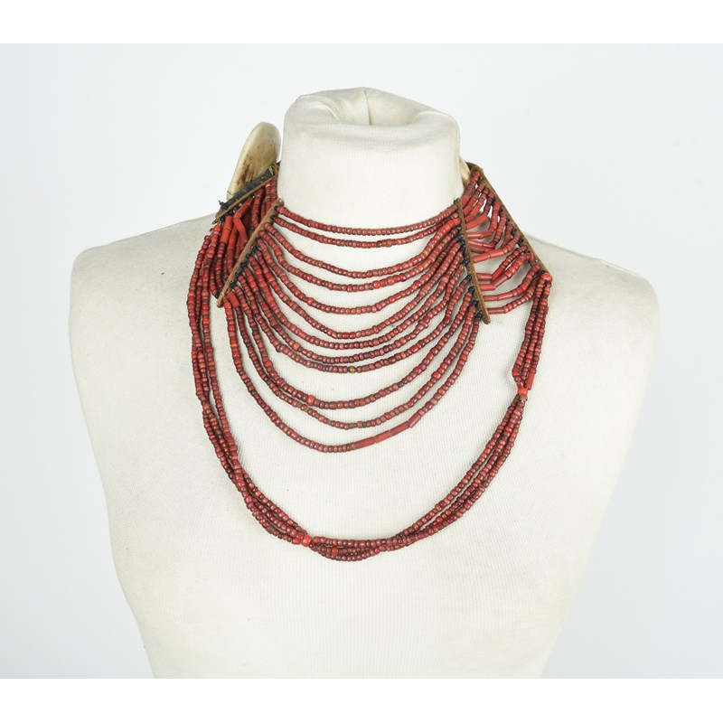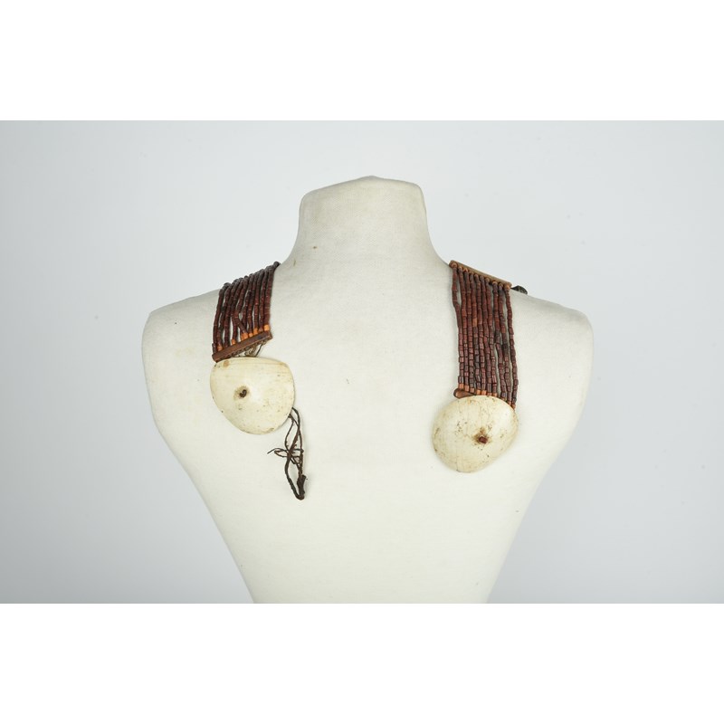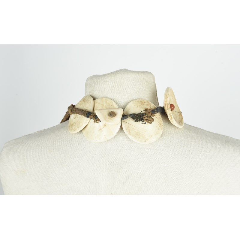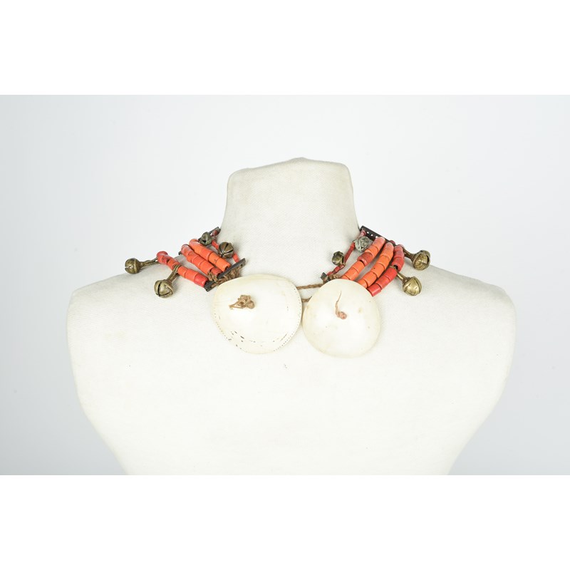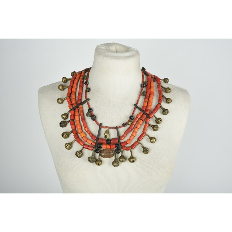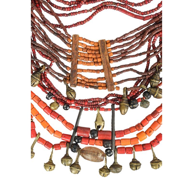 coloured glass beads with shell, one with carnelian beads, two with bone spacers and two with brass bell pendants,
