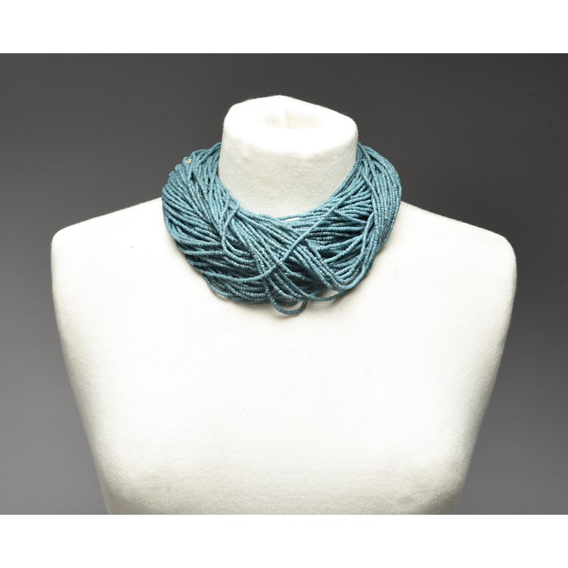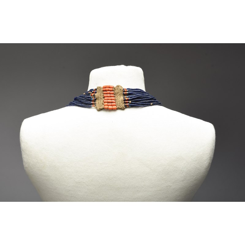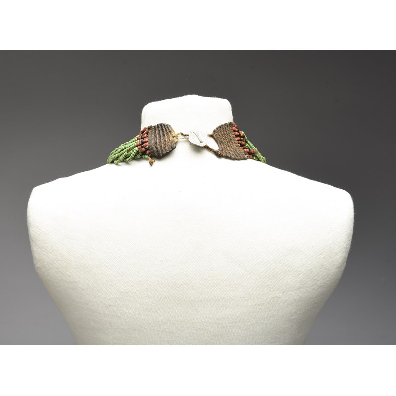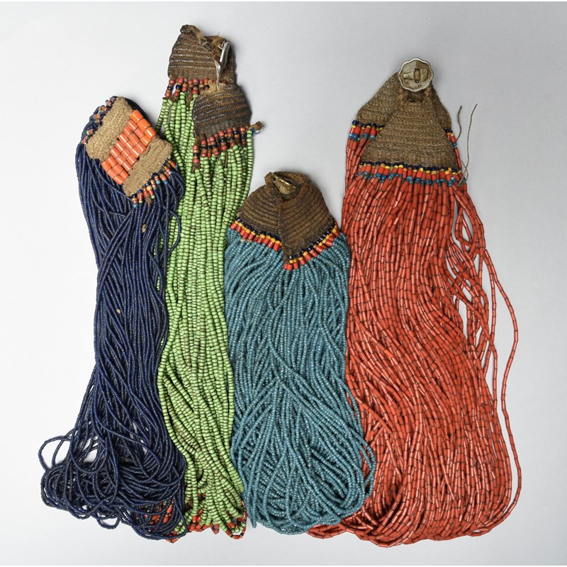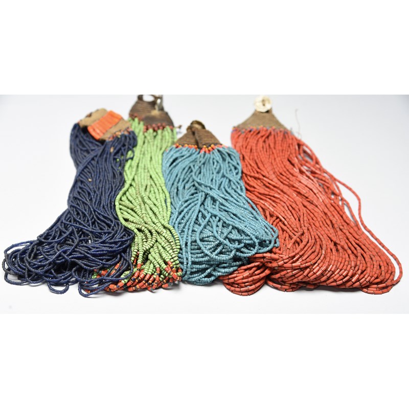 coloured glass beads and fibre, two with coin clasps and one with a metal clasp,