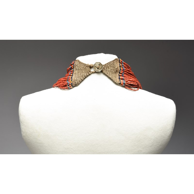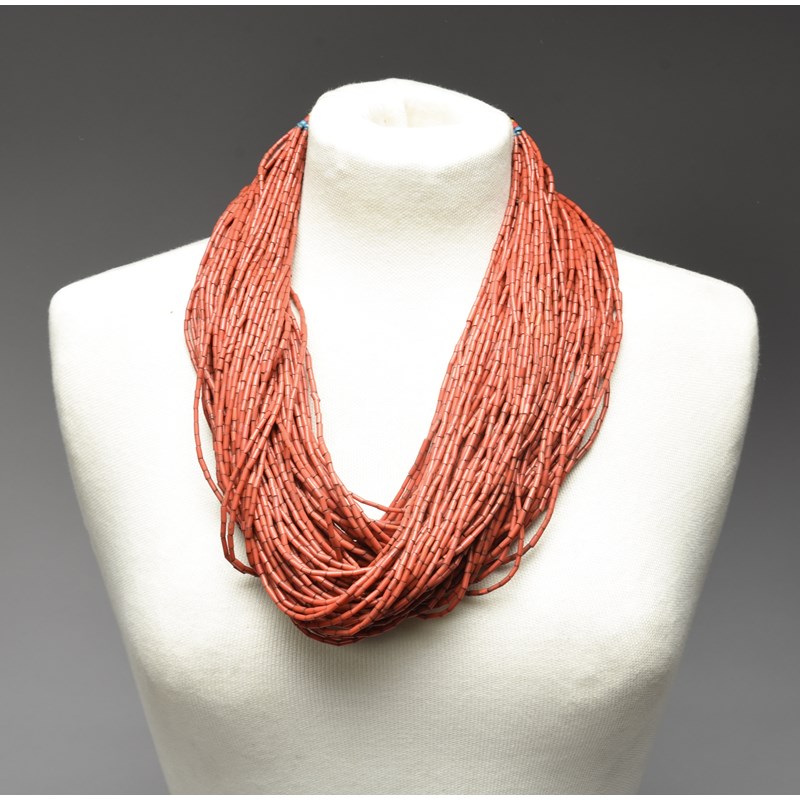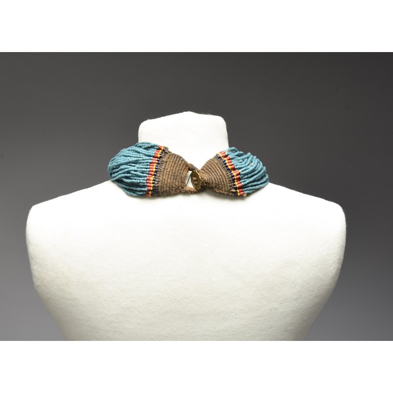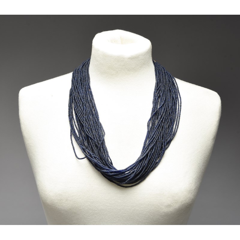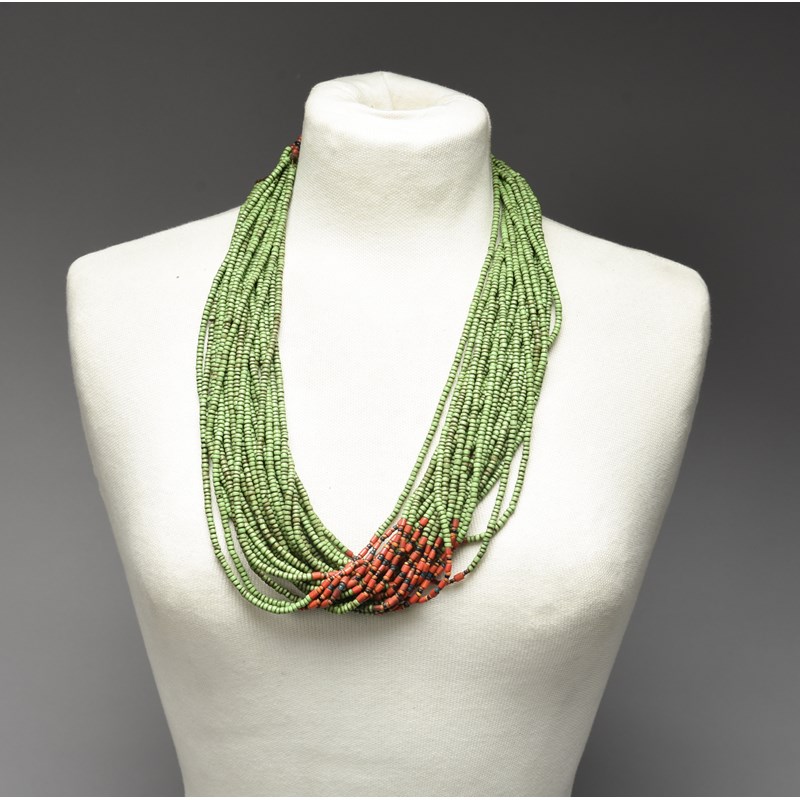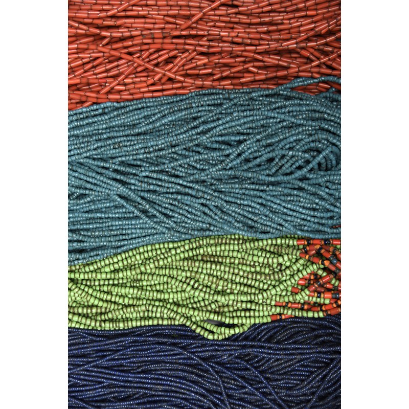 coloured glass beads and fibre, two with coin clasps and one with a metal clasp,