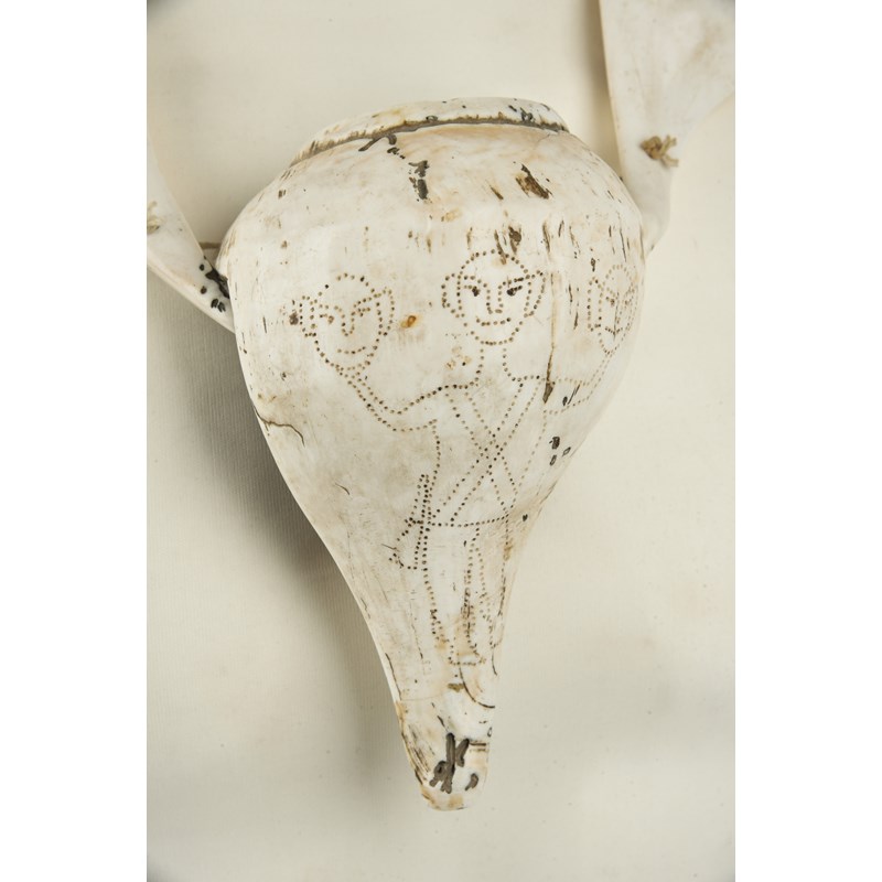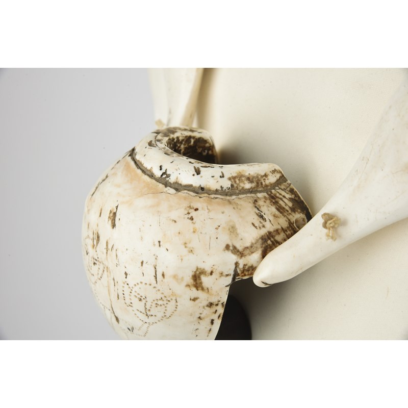 with three chank shells, the larger dot decorated a standing warrior holding a head in each hand, the inside with a bound wood support, the other two chanks with a dot bands and an X, strung with glass and shell beads with bone spacers,